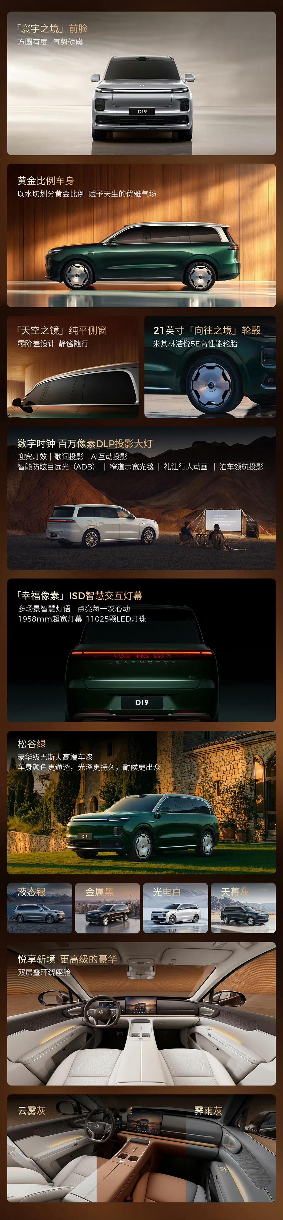 零跑 D19 预售价 25-30 万,号称「用 B 级价格买 D 级豪车」——半苯胺真皮、天鹅绒顶棚、三排电动调节、500km 纯电续航....配置确实拉满了。先说几个亮点:内饰用料跟尊界 S800 同源、25㎡ 软包覆盖、珍珠打孔工艺+V字绗缝...这些材质工艺确实是百万级豪车的标准。三排座椅还配电动加热+遮阳帘,森野氧舱 8L/min 制氧、冷暖冰箱 -6°C 到 50°C,这些细节在 30 万价位段确实少见。动力续航也够硬:80.3kWh 混动电芯、增程版纯电 500km、纯电版 720km、800V 快充 16 分钟30%-80%,这数据吊打一众竞品。双腔空悬+CDC减震、三电机四驱3秒破百、圆规掉头+爆胎稳定...技术栈也齐了。零跑D19懂什么叫更高级的豪华