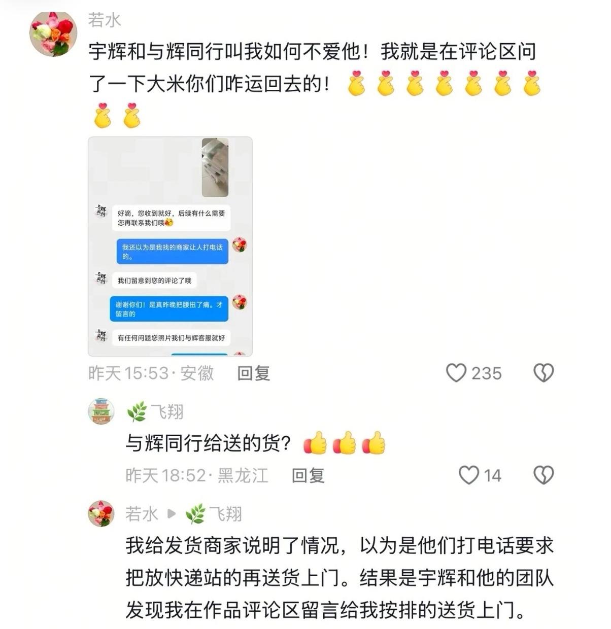 与辉同行的定制大米送货上门? 是真的吗? 确实是真的。 这是啥待遇? 不就是买了几单大米吗? 宇辉还安排人直接送货上门了。[大笑][大笑] 前几天一个消费者在与辉同行购买了定制大米, 一不小心“手欠”就多买了几袋, 买的时候开开心心, 大米到货了可愁死人。 因为这个消费者受伤了, 这么多米怎么拿回去啊。 其实她就是在评论区吐槽开个玩笑, 没想到与辉同行客服看到了, 于是宇辉就联系商家, 让他们联系快递, 直接把大米送货上门。 消费者接到电话的时候还以为是商家安排的, 结果最后才知道, 是与辉同行工作人员在评论区看到留言直接给安排的。 呵呵呵, 这待遇真的好啊, 太让人羡慕了。 董宇辉早就说过, 他们有专门的工作人员在各大平台收集消费者的各种反馈意见, 不管是产品问题还是售后服务问题, 他们都一直非常重视消费者的真实反馈, 只有真正听到看到消费者的呼声, 才能为大家做更好的服务。 这才是真正的顶级直播间, 只有真正共情与消费者, 才能走的更高更远。 董宇辉的阳谋, 试问此局你们如何破? 散会! 董宇辉