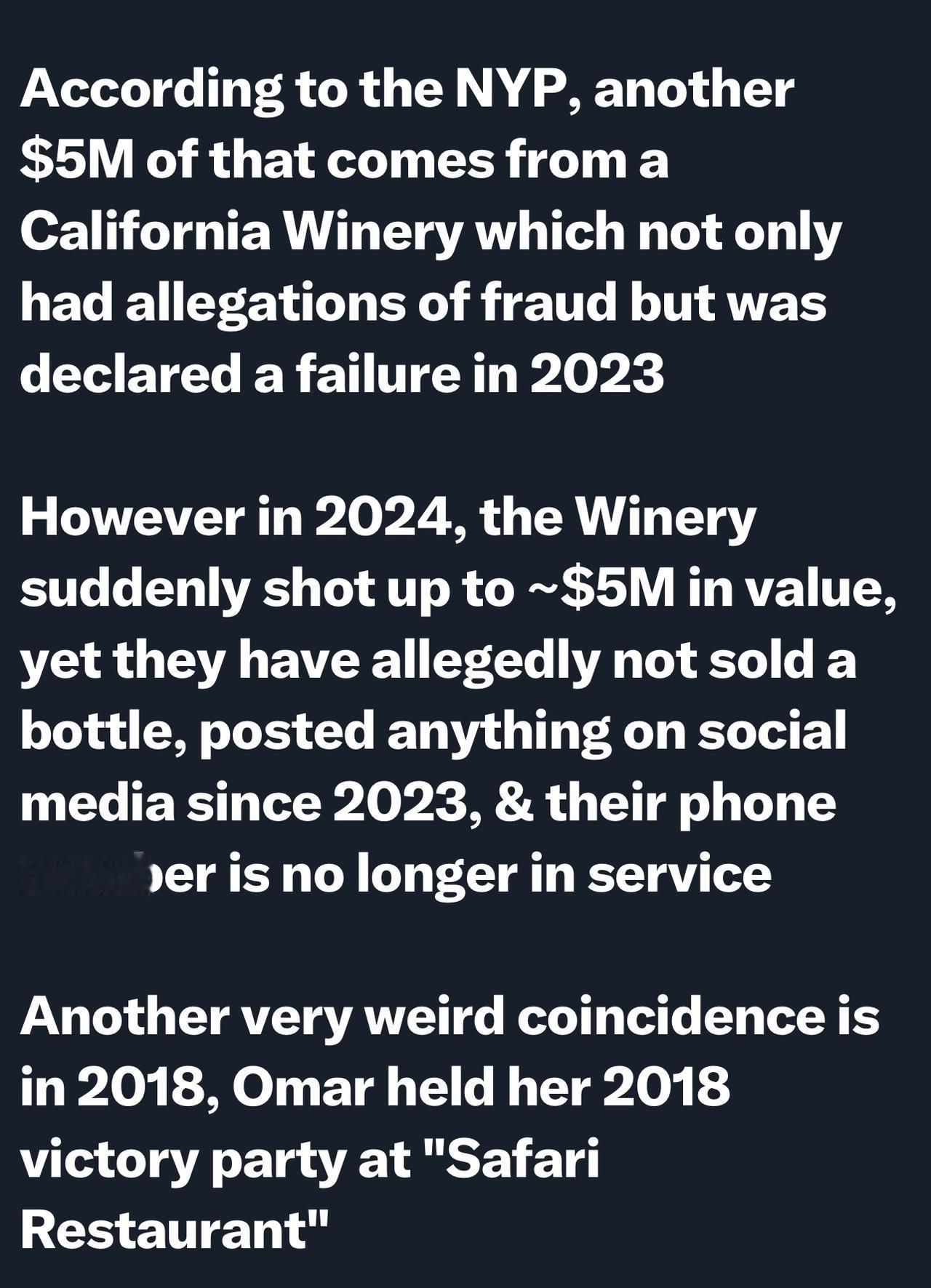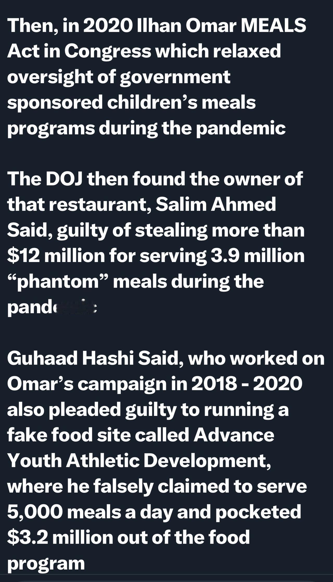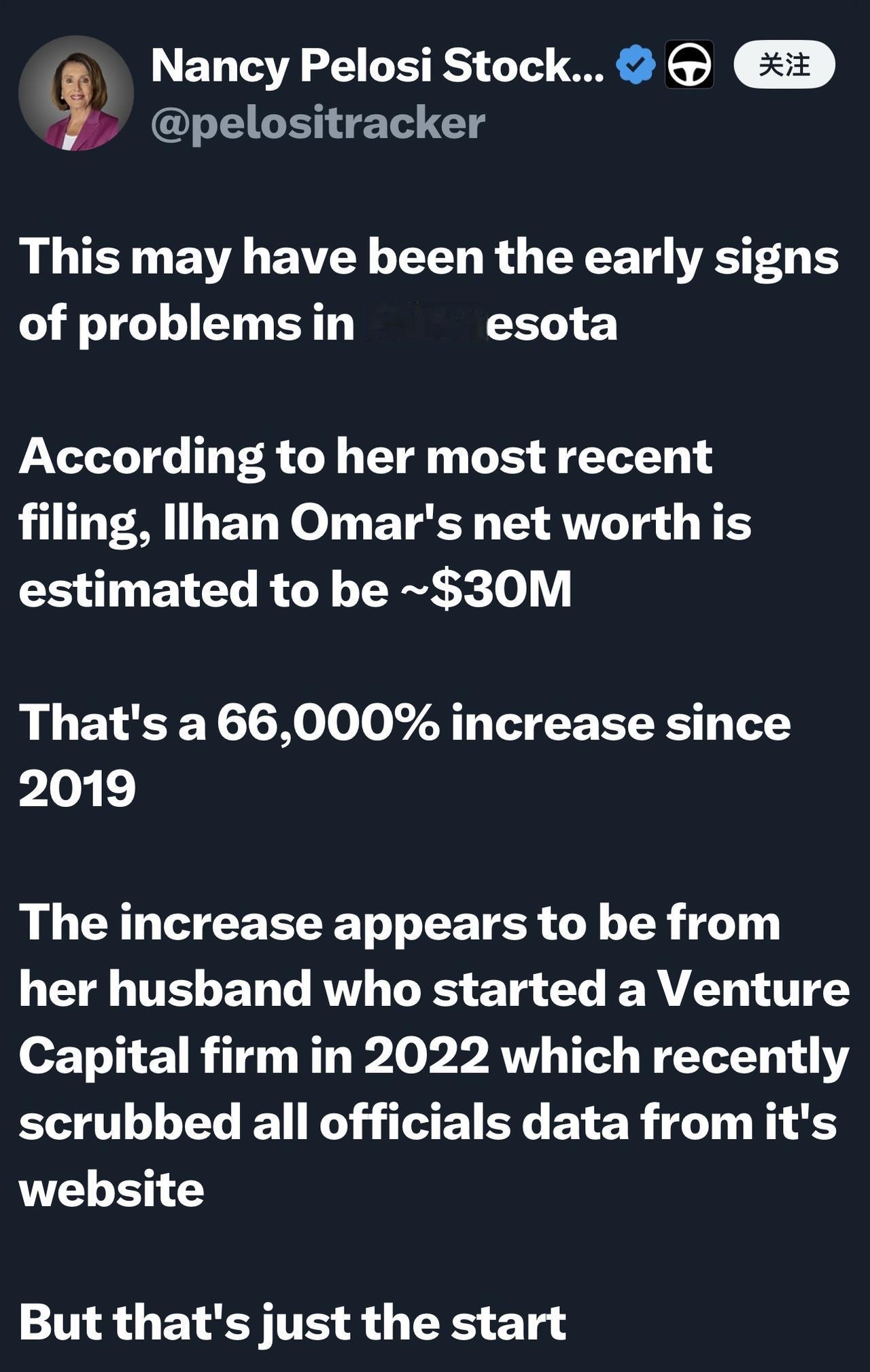 对于明尼苏达州的欺诈案件,连自己人都看不下去了,美国前众议长佩洛西发长贴: “这或许是明尼苏达州出现问题的早期迹象。 根据伊尔汗·奥马尔最近提交的文件,她的净资产估计约为3000万美元。 与2019年相比,增长了66000%。 这一增长似乎来自她的丈夫,他于2022年创办了一家风险投资公司,该公司最近从其网站上删除了所有官方数据。 但这仅仅是个开始。 据《纽约邮报》报道,另有500万美元来自一家加州酒庄,该酒庄不仅被指控存在欺诈行为,而且在2023年被宣布破产。 然而,到了2024年,这家酒庄的估值突然飙升至约500万美元,但据称他们自2023年以来一瓶酒都没卖出去,也没在社交媒体上发布任何内容,而且他们的电话号码也已停用。 另一个非常奇怪的巧合是,2018年,奥马尔在“Safari餐厅”举办了她的2018年胜选庆祝派对。 随后,2020年国会通过了《伊尔汗·奥马尔膳食法案》,该法案放松了疫情期间政府资助的儿童膳食计划的监管。 美国司法部随后认定该餐厅老板萨利姆·艾哈迈德·赛义德犯有盗窃罪,罪名是他在疫情期间提供了390万份“幽灵”餐食,涉嫌盗窃超过1200万美元。 曾在2018年至2020年期间参与奥马尔竞选活动的古哈德·哈希·赛义德也承认运营一个名为“推进青少年体育发展”(Advance Youth Athletic Development)的虚假食品网站,他谎称该网站每天提供5000份餐食,并从食品项目中骗取了320万美元。”