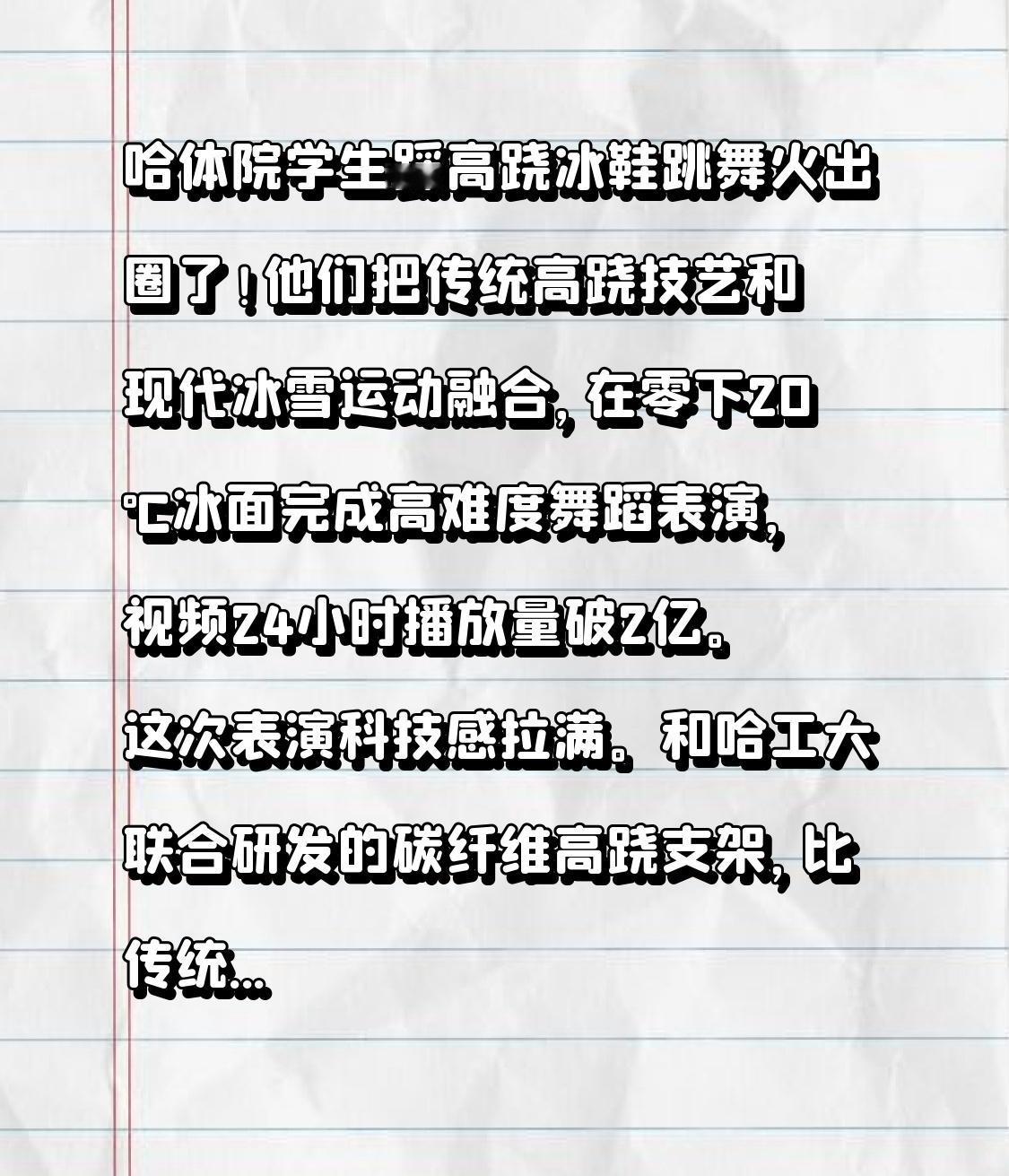 哈体院学生踩高跷冰鞋跳舞火出圈了!他们把传统高跷技艺和现代冰雪运动融合,在零下20℃冰面完成高难度舞蹈表演,视频24小时播放量破2亿。 这次表演科技感拉满。和哈工大联合研发的碳纤维高跷支架,比传统木质轻60%,仅3公斤;冰刀用航天级钛合金,刃口薄却超能抗冲击。还通过一系列操作让稳定性提升40%。 艺术上也很有看头,以《梁祝》为配乐,穿水墨服饰,结合古典舞与冰雪运动特点,冰面滑出太极图案,分三篇章演绎。不得不说,哈体院学生这波操作太牛,真正实现了技术与艺术的双重突破!