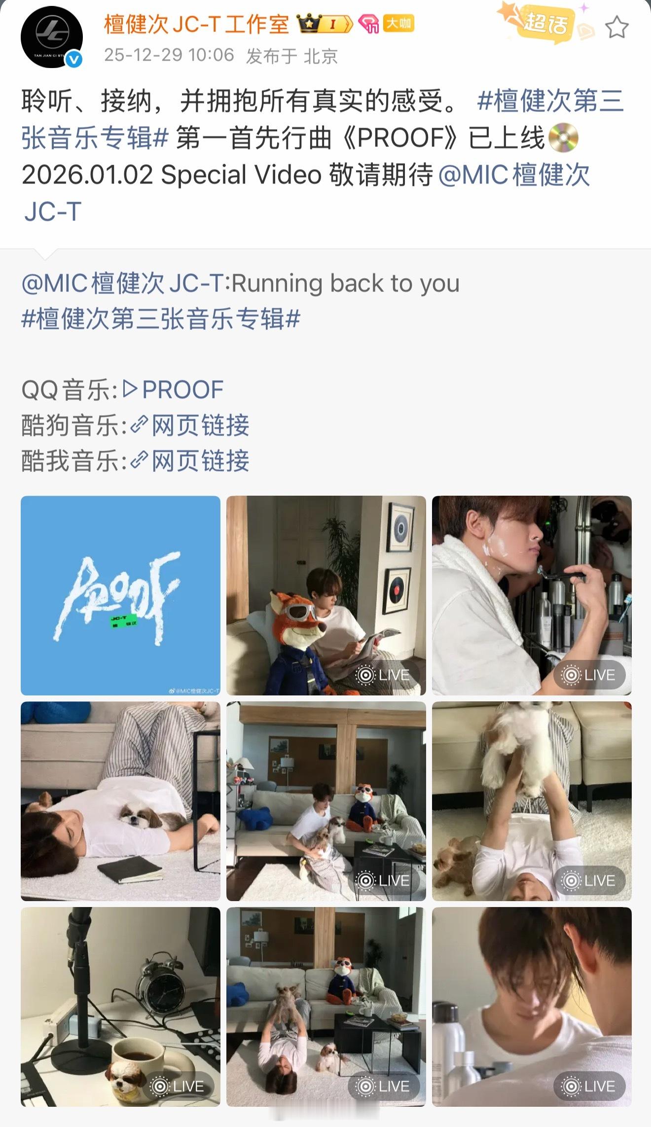 檀健次第三张音乐专辑 第一首先行曲《PROOF》上线啦,空降QQ音乐日榜第一,一起来听歌啦。