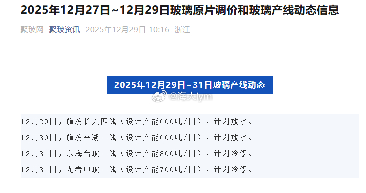 2025年12月29日~31日玻璃产线动态(来源:聚玻资讯)12月29日,旗滨长兴四线(设计产能600吨/日),计划放水。12月30日,旗滨平湖一线(设计产能600吨/日),计划放水。12月31日,东海台玻一线(设计产能800吨/日),计划冷修。12月31日,龙岩中玻一线(设计产能700吨/日),计划冷修。玻璃期货