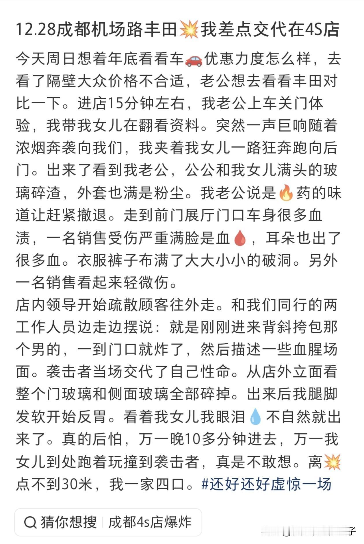 太险了!成都丰田4s店爆炸,有在现场看车的顾客说,他们一家人刚从隔壁大众走进丰田店内,大概过了15分钟,突然就听到一声巨响,然后吓得所有人就都向外面狂奔。 走到展厅门口时,看到地上有很多血渍,其中有一名销售用手捂着耳朵,看起来受伤挺严重的,脸上和耳朵都是血,身上的衣服裤子也破了很多洞。 另一名销售告诉他,段某之前来过店内好几次,想要回定车的钱,说他钱不够不想买车了,但定金是不退的,这次他背着个挎包,走到店门口直接就引爆了。 唉,双输的局面啊,估计4s店要是早知道会发生这样的事,肯定直接退给他了,现在不仅损失惨重,店后续估计也开不下去了!