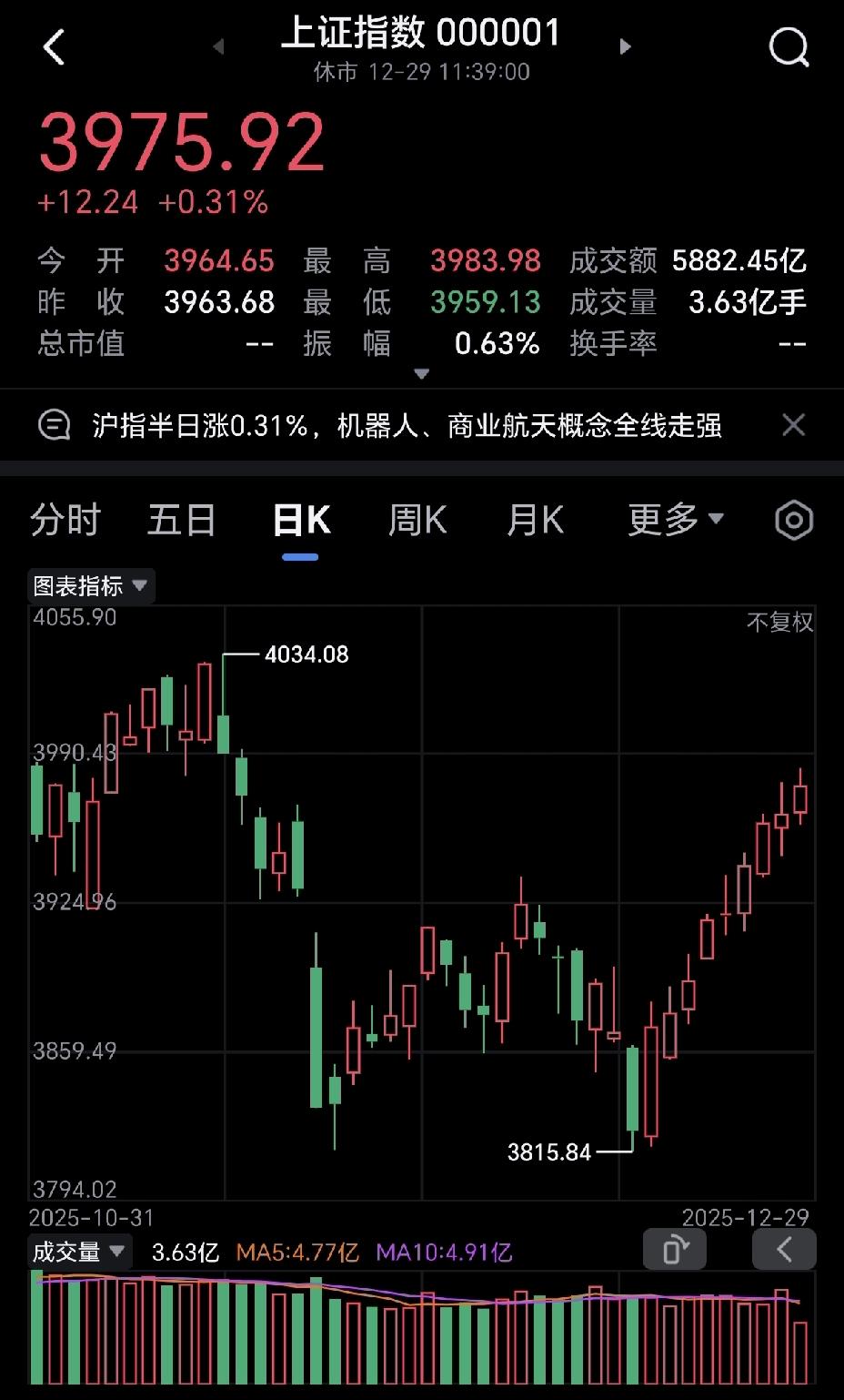 大盘破天荒已上涨了9个交易日了! 这段时间,大盘一直上涨,那些空仓的股民是不是懊悔不已? 如果今天大盘一直保持上涨,意味着已连续第九个交易日上涨,这在大A股市交易中非常罕见。 有网友说,离2025年结束还有两个交易日,会不会连续上涨11个交易日?这完全有可能。 那些一直等大盘暴跌的股民,一天天内心比较纠结,买吧,又怕买在了高处,不买吧,每天看着大盘翻红,那种滋味很难受。 大家这两天有没有入市?