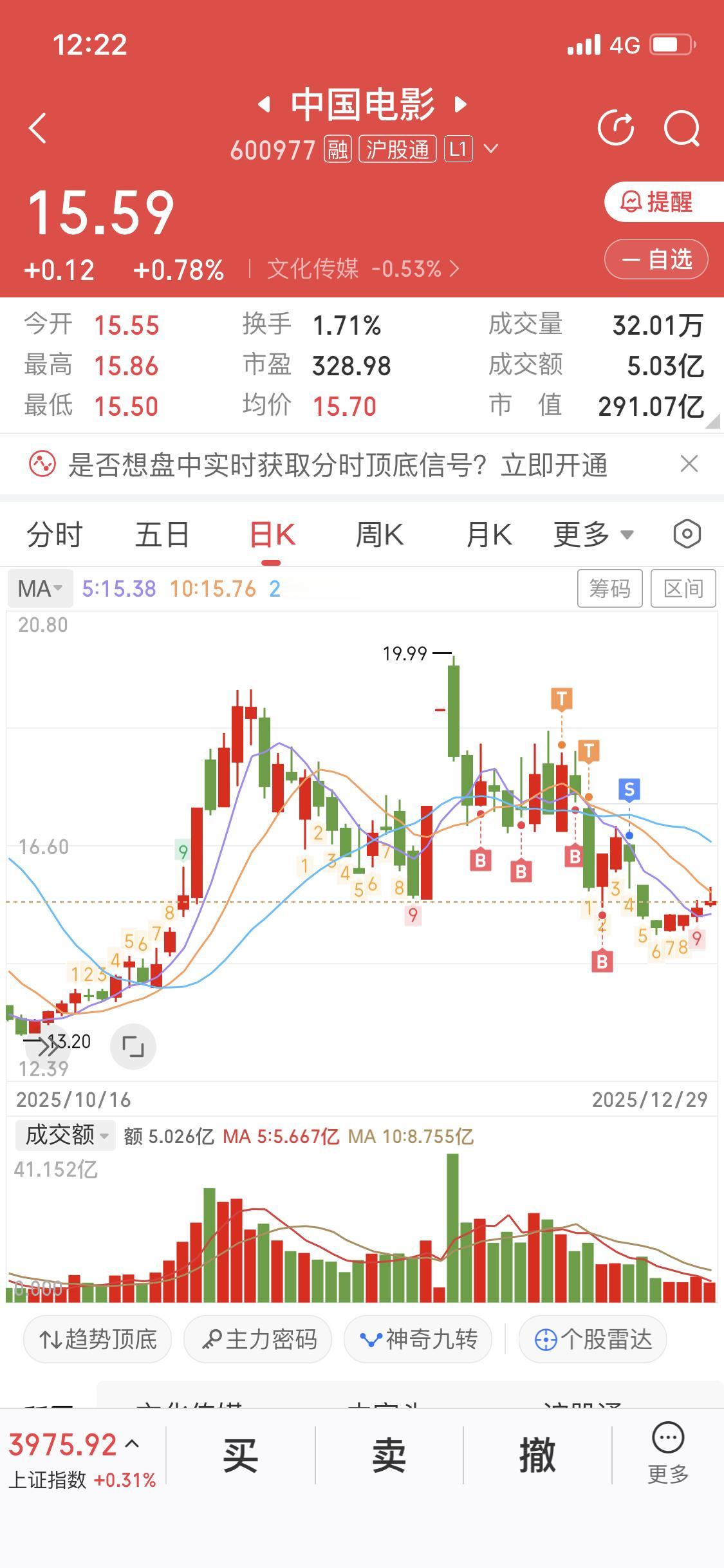 12 月 29 日中国电影这走势挺让人惊喜,缩量上涨意味着抛压小,而且已经有企稳回升的迹象了。这就好比一艘在风浪中飘摇的船,终于找到了稳定的航向。 春节电影档一直是个香饽饽,好多大片都会扎堆上映,票房往往也很可观。就像之前的春节档,不少电影都赚得盆满钵满,相关影视股也跟着起飞。现在中国电影有了这种向好趋势,我也有点心动想加仓。不过投资这事儿也得谨慎,谁也不能百分百保证春节档就一定大赚,但目前这形势确实给了人不少信心,就看后续能不能借着春节档这股东风,一路高歌猛进了!