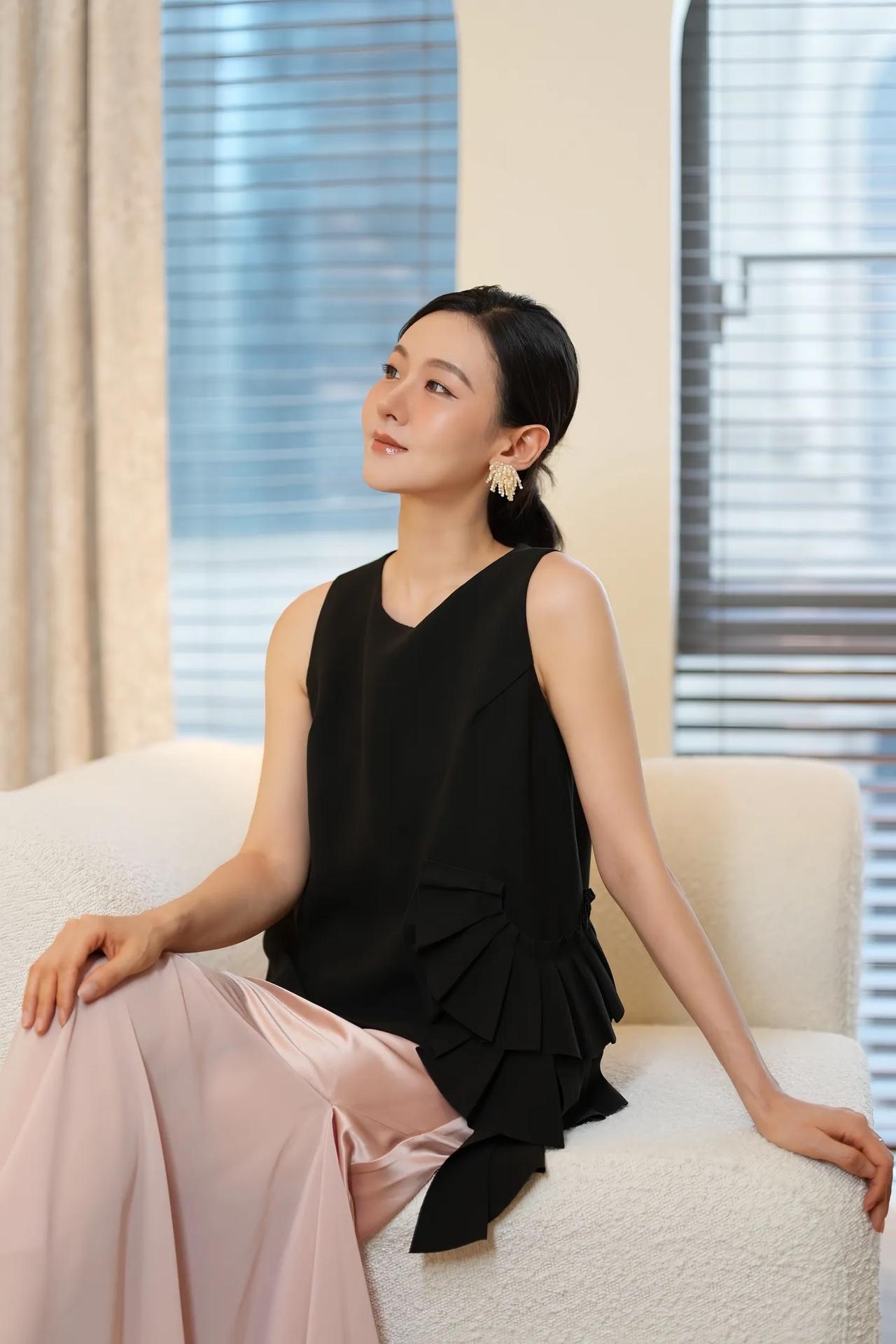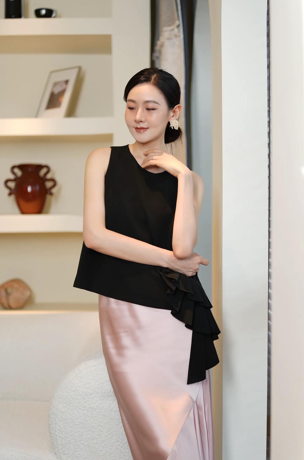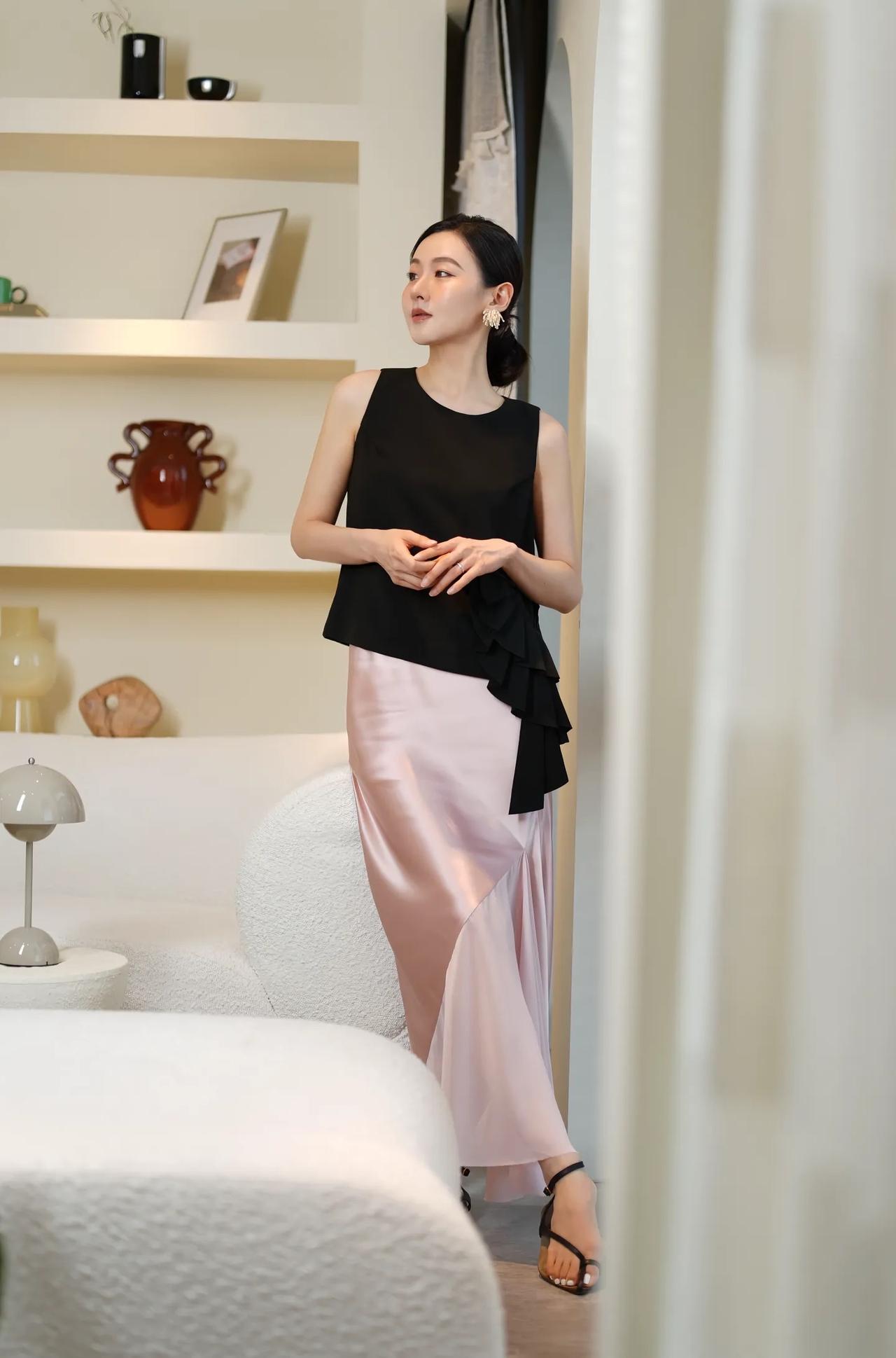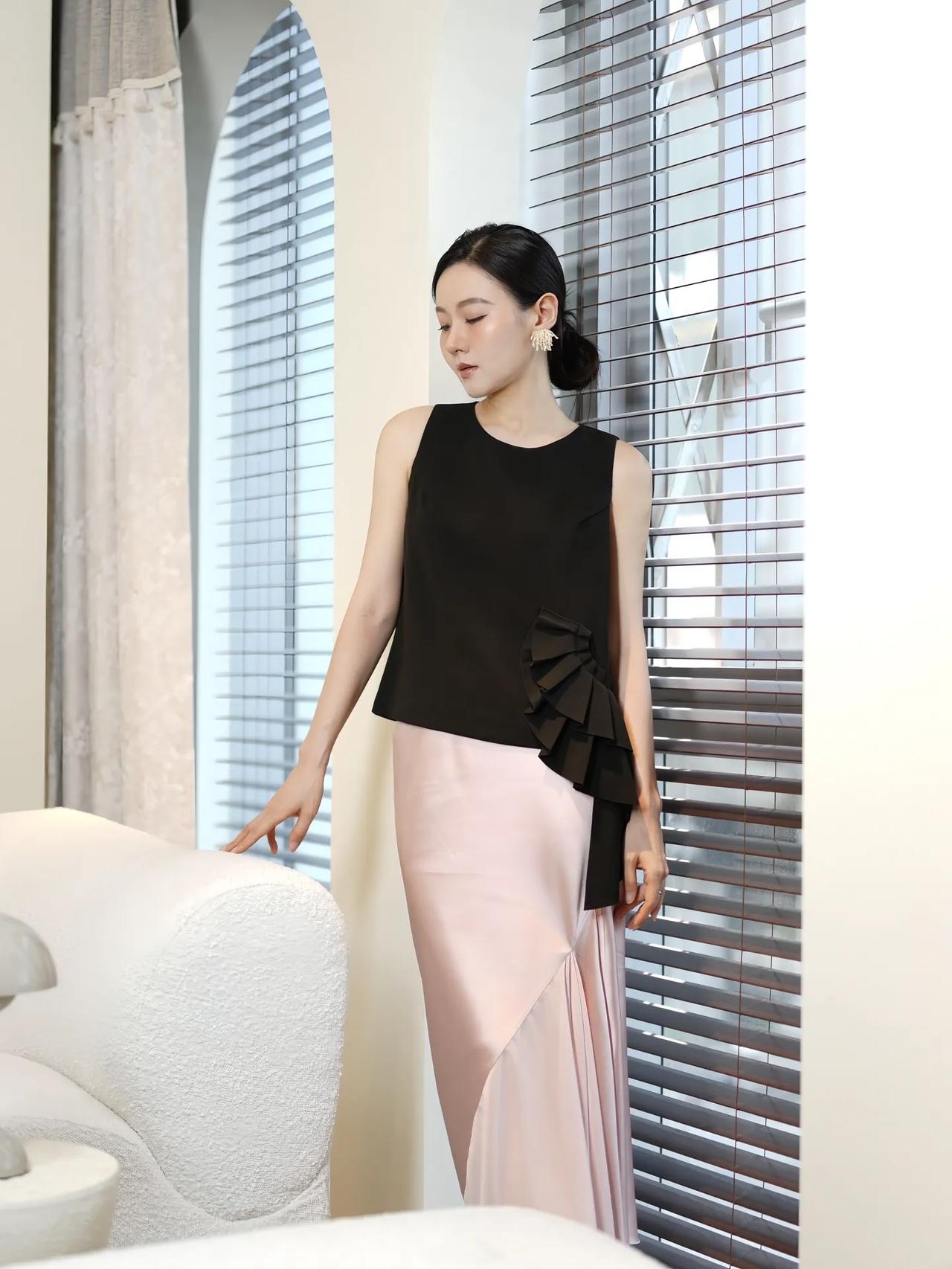 优雅黑裙搭配粉色长裙,简约时尚,尽显女性魅力。