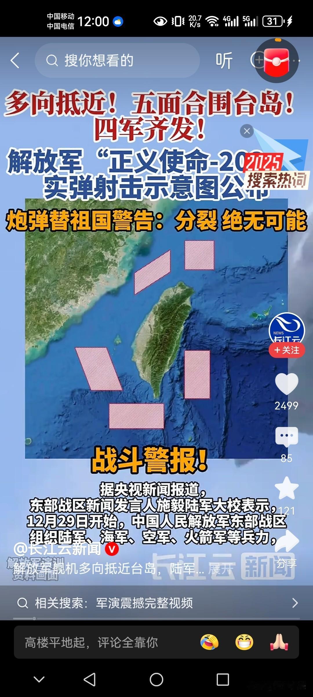 演习的目的就是为了实战! 东部战区这次演习可谓是全方位的海陆空和火箭军等兵种,对台湾进行五面合围,可谓是铁桶般牢牢把台湾困在其中! 东部战区发言人称:警告台独,分裂觉无可能! 对于台湾人民来说台湾回归,有祖国大陆做依靠做靠山,台湾人民很高兴! 只有台独会瑟瑟发抖,因为台服分子长期黑化大陆,台湾人民缺乏对大陆了解! 台湾回归,台湾人民了解大陆的强大,知道台独分子的险恶中心,台独分子失去民心,下场不会好到哪去!台湾岛周边军演 硬核东部战区