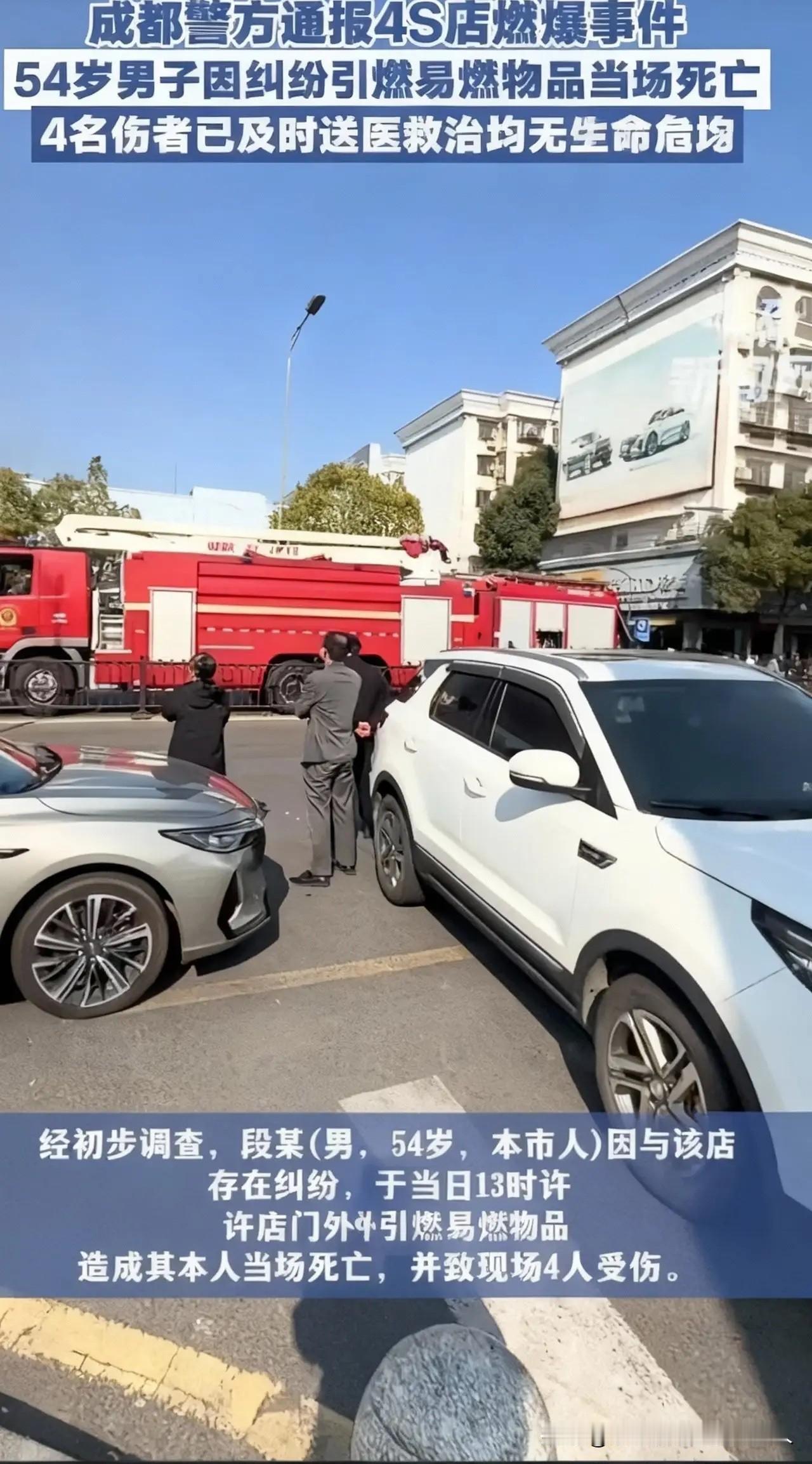 成都4S店燃爆悲剧:2万定金酿1死4伤,冲动维权要不得 今天下午1点多,成都高新区一家丰田4S店门口突发燃爆,54岁的段某当场身亡,店内4人受伤,万幸都没有生命危险。 这事的起因很揪心:段某买车交了2万定金,后来不想买了要退钱,店方说按规矩定金不能退。几次沟通都没结果,段某带着易燃物找上门,情绪上头点燃了东西,不仅赔上了自己的命,还连累了4个无辜的人,现场玻璃碎一地,一片狼藉。 定金和订金一字之差差别大,很多人确实容易踩坑,但再憋屈也不能走极端。命没了,啥都没了,家人还得承受无尽痛苦,原本的维权诉求也彻底泡汤。 说到底,维权得走正道,12315、消协、法律援助都是靠谱渠道,千万别让一时冲动,把自己和别人的人生都毁了。商家也该多点温度,别把小事拖成无法挽回的悲剧。