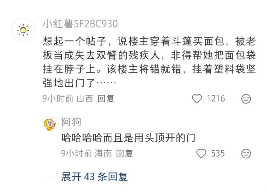 穿着斗篷买面包,被老板当成失去双臂的残疾人,非得帮她把面包袋挂在脖子上。该楼主将错就错,挂着塑料袋坚强地出门了......
