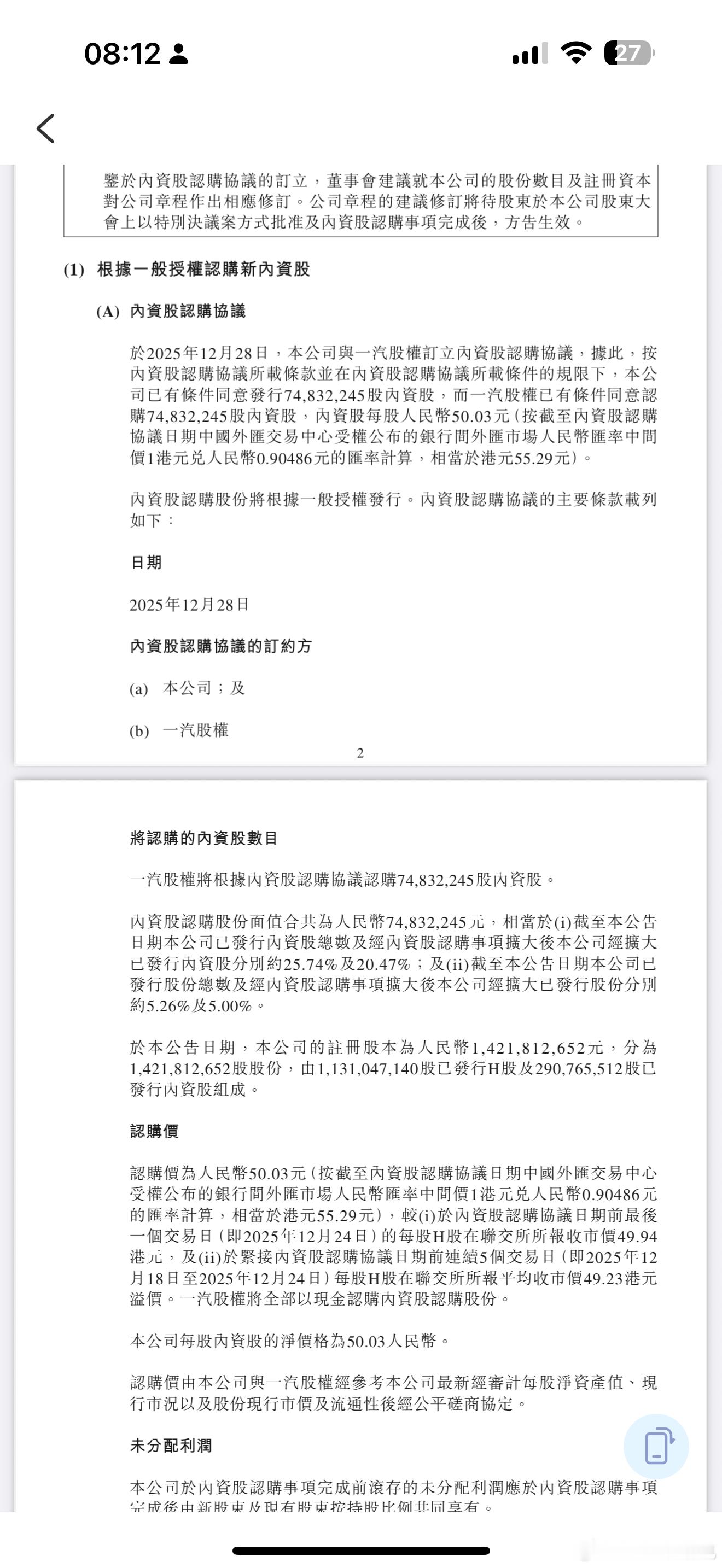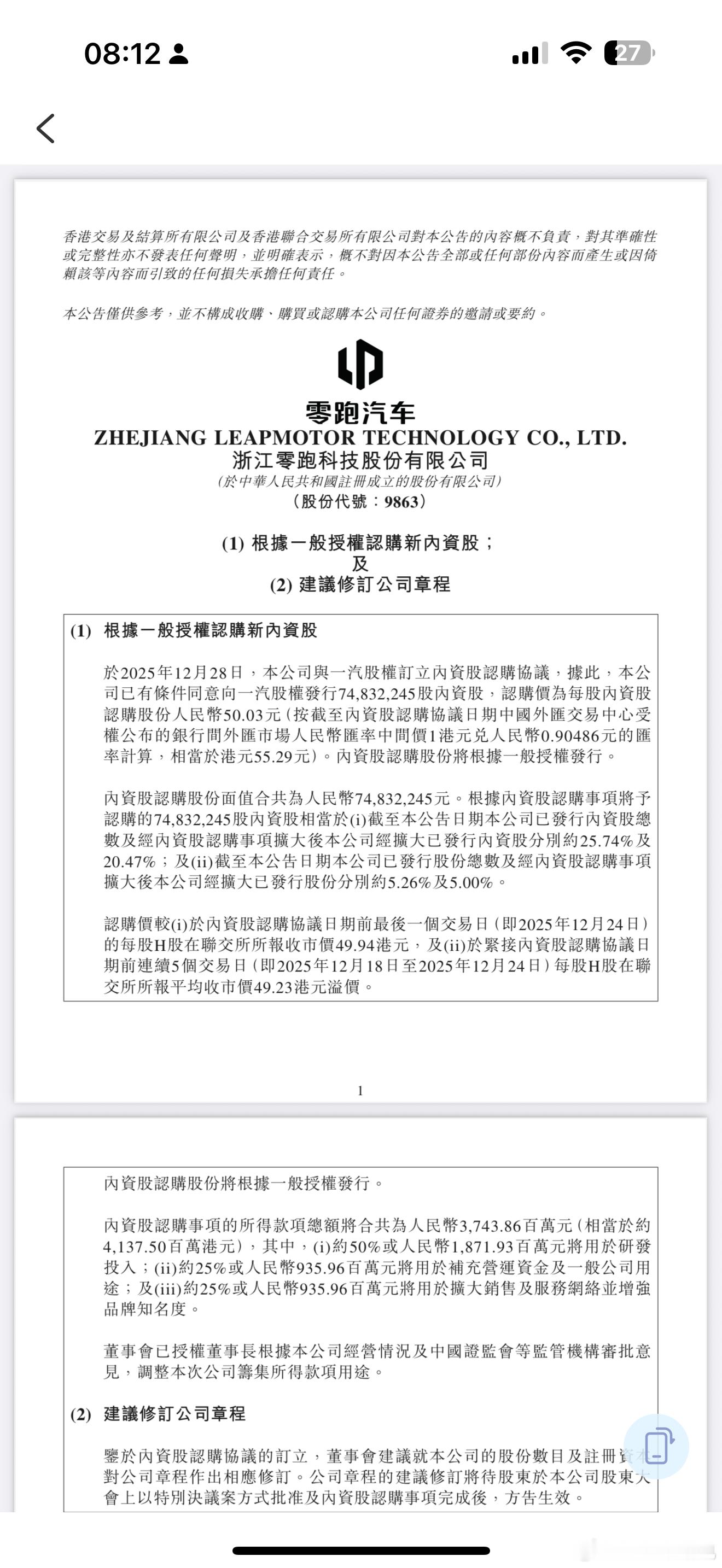 零跑汽车:拟向一汽股权发行内资股 总筹约37.4亿元零跑汽车在港交所公告,于2025年12月28日,公司与一汽股权订立内资股认购协议,据此,公司已有条件同意向一汽股权发行74,832,245股内资股,总额将合共为人民币37.4386亿元(相当于约41.3750亿港元)其中约50%将用于研发投入,约25%将用于补充营运资金及一般公司用途,约25%将用于扩大销售及服务网络并增强品牌知名度