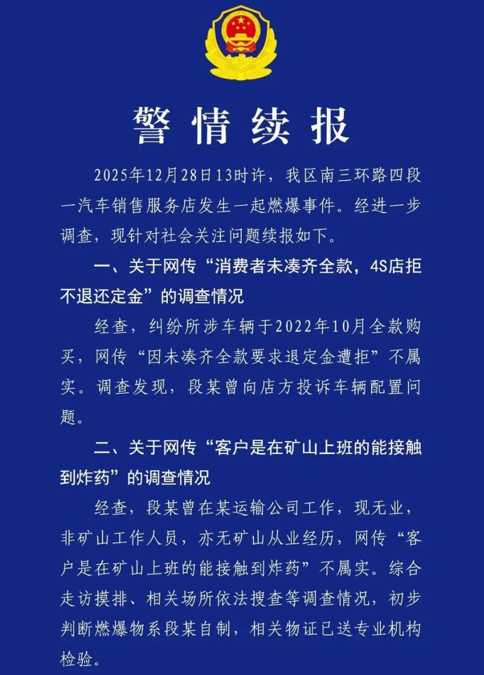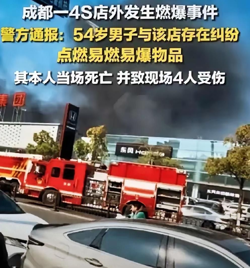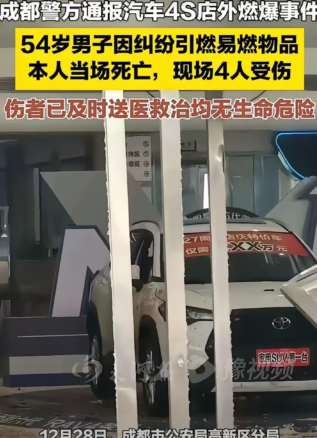 造谣一张嘴,辟谣跑断腿! 成都丰田4S店外燃爆事故,相关部门再通报,网传均为不实消息。 1、网传因为定金不给退的纠纷,子虚乌有,事实上纠纷者是三年前全款买的车,纠纷源自车辆配置问题。 2、网传纠纷者以前在矿山工作,能接触到炸药,更是谣传。事实上,纠纷者曾在运输公司工作,无矿山工作经历,当前无业。 据相关部门初步判断,燃爆物系自制,而不是从山上背下来的炸药,网传者靠臆想,猜测散播谣言,已被拘。 大家不要被带节奏,事情还没水落石出之前不站队,不轻意评价对错。当天监控显示,纠纷者进店与销售人员沟通时情绪已相当激动,双方发生激烈争执,但并未动手。 后纠纷者愤而离店,留下了那句惊人的警告,五分钟后再次出现,手中已握着不知从何而来的爆炸装置,点了,一死四伤,两败俱伤。 此事真相如果还待调查,但给到大家一个警示:遇到不顺心的事要冷静,先寻求正规渠道解决,现在网络的力量那么大,很多事不必钻牛角尖,人没了就什么都没了,还留给亲人永久的伤痛! 丰田店爆炸 成都丰田4S店爆炸