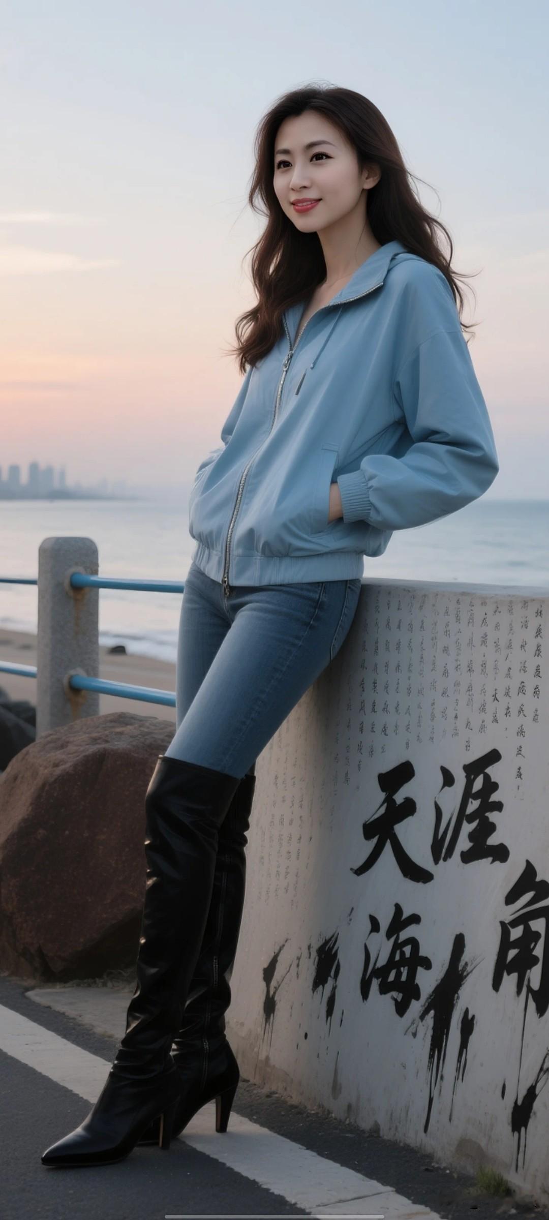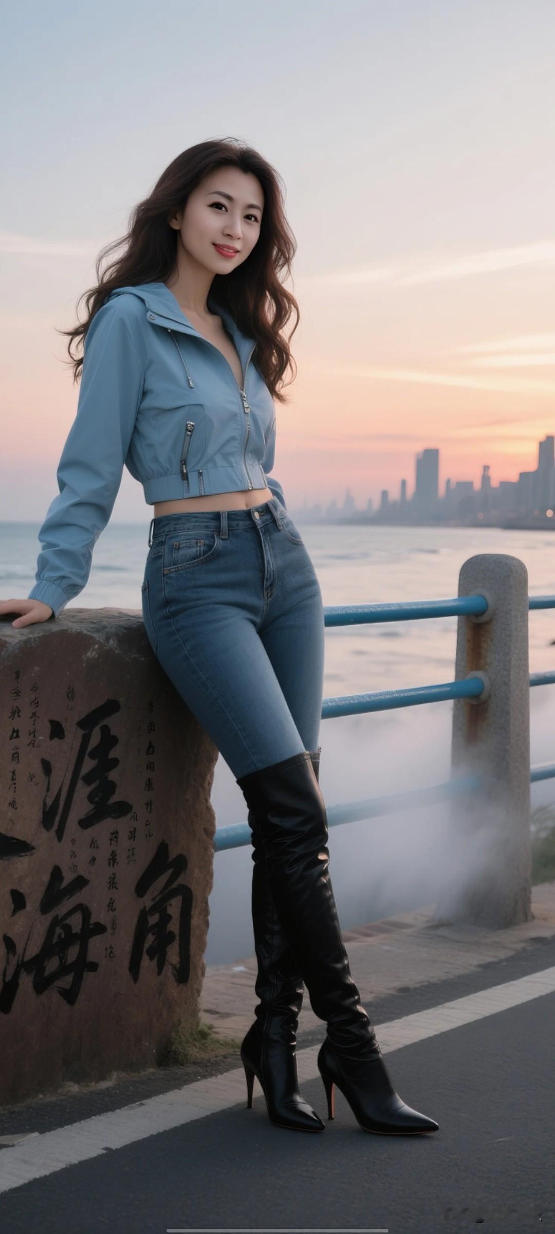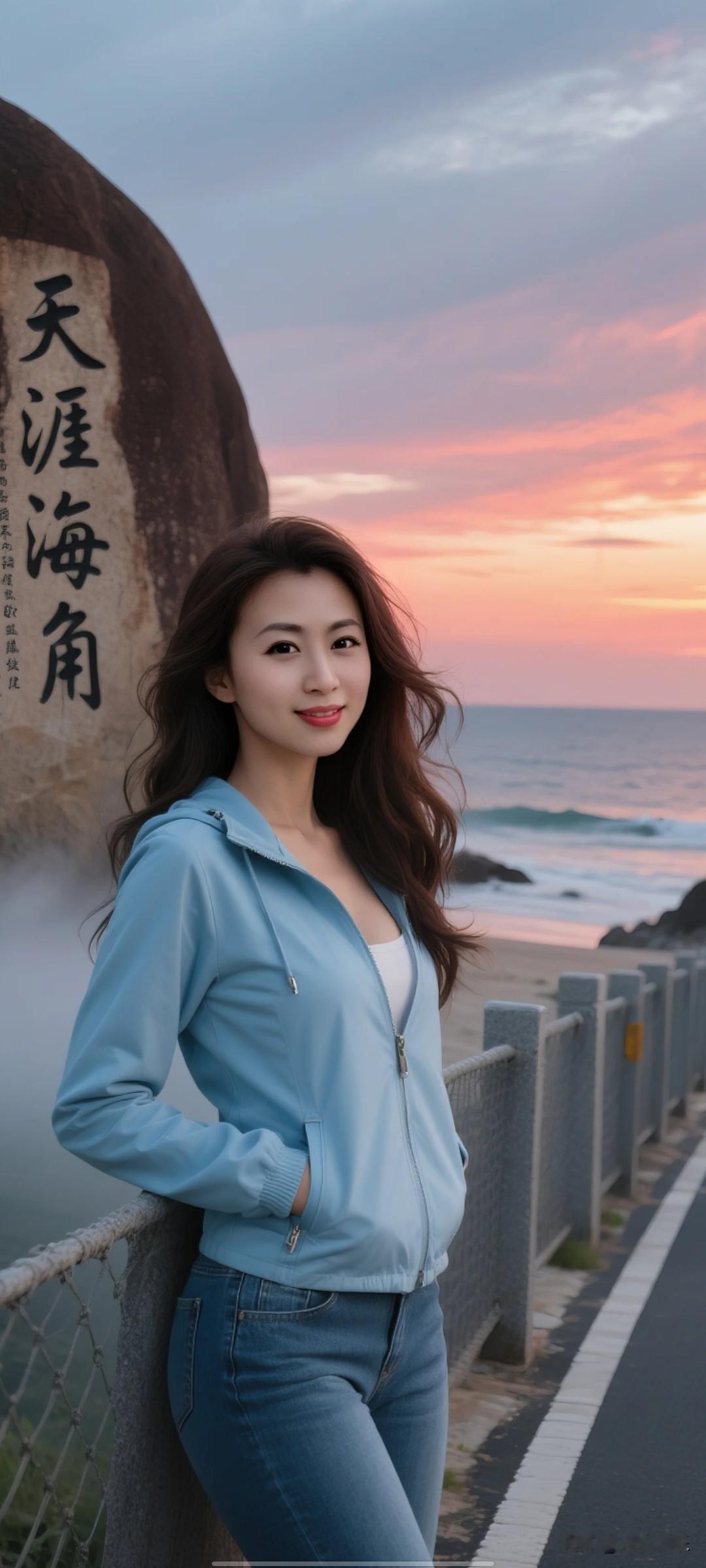 御姐上围挺拔饱满、身材高挑,曲线优美,沙漏型身材的年轻美女,皮肤白皙、底妆通透,五官精致,气质优雅清冷,深棕调长发微带蓬松凌乱感,几缕发丝轻垂脸颊,既保留了慵懒随性,又衬出冷艳氛围,上身穿浅蓝色冲锋衣,下身穿一条修身牛仔裤,修长笔直的腿部线条。脚上一双哑光黑色尖头细高跟过膝靴,紧贴腿部,尽显现代轻奢气质,御姐靠在马路围栏旁边,背后有大海,大海广阔,能看到些城市轮廓,时间是傍晚晚霞时分,晚霞很浓烈,整体氛围孤寂、略带忧郁,一块深褐色顽石上刻字:“天涯海角”,泼墨字体,顽石上镌刻密密麻麻的小字,人间仙境,仙雾弥漫