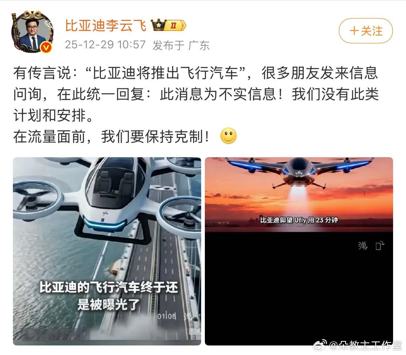 有传言说:“比亚迪将推出飞行汽车”,很多朋友发来信息问询,在此统一回复:此消息为
