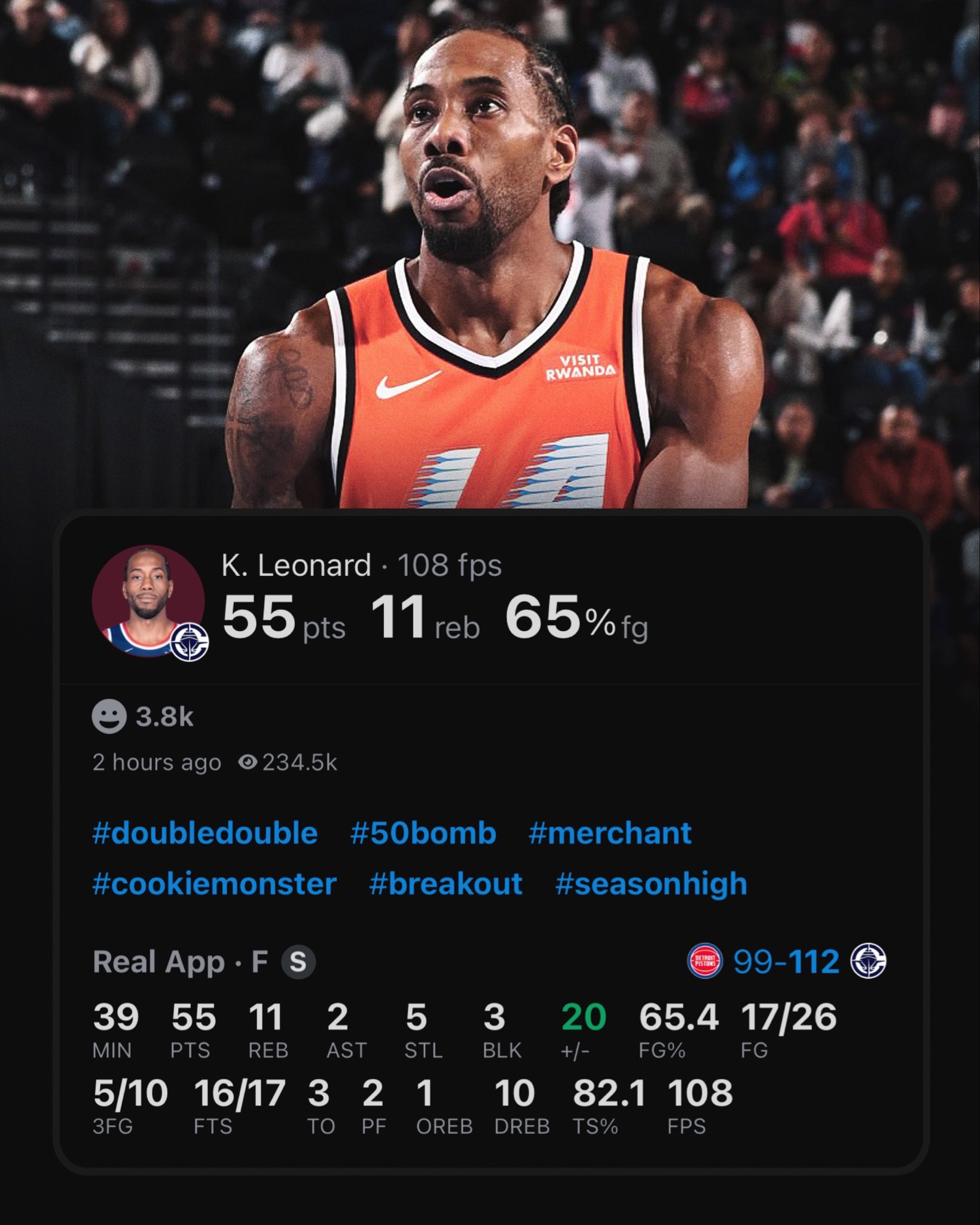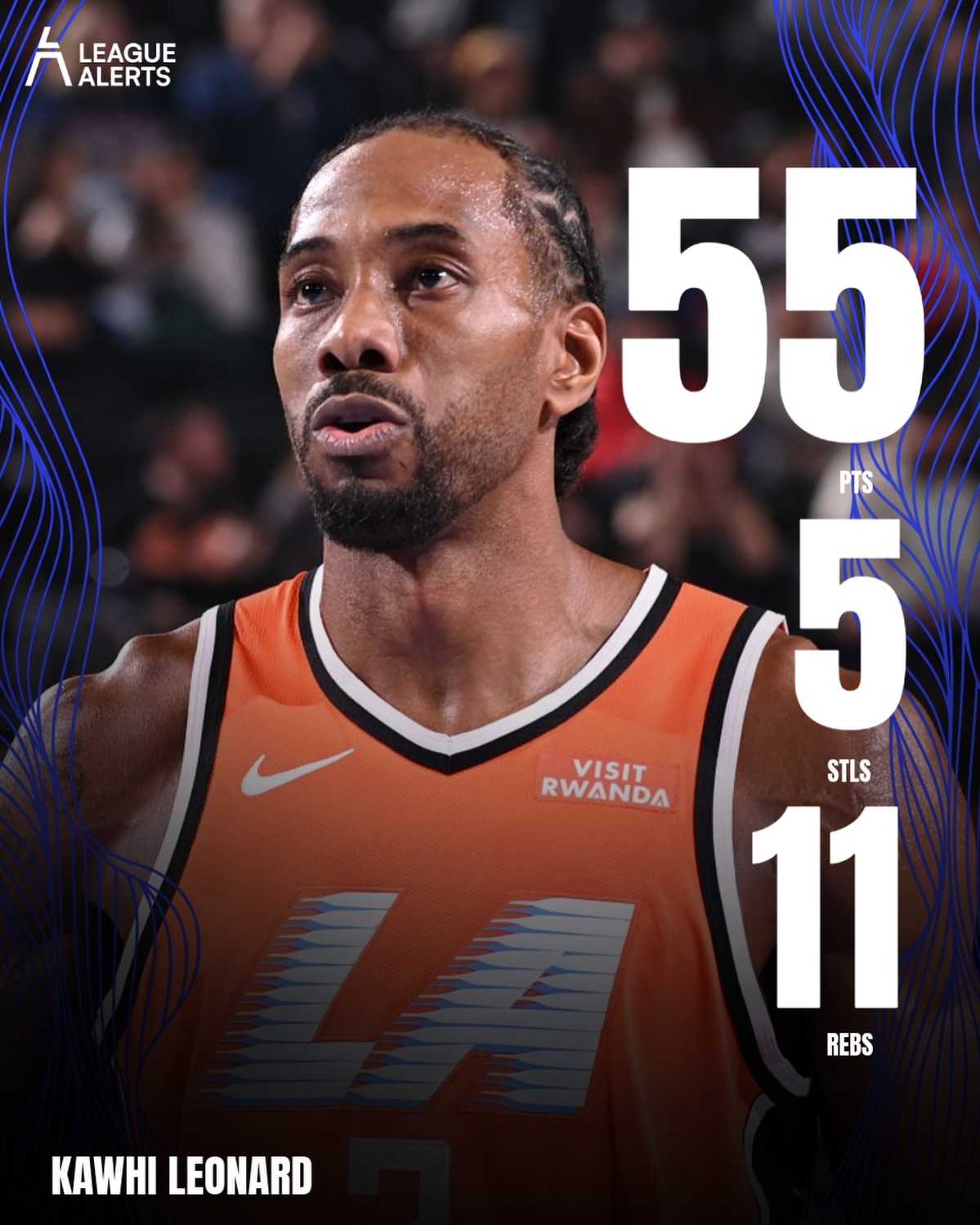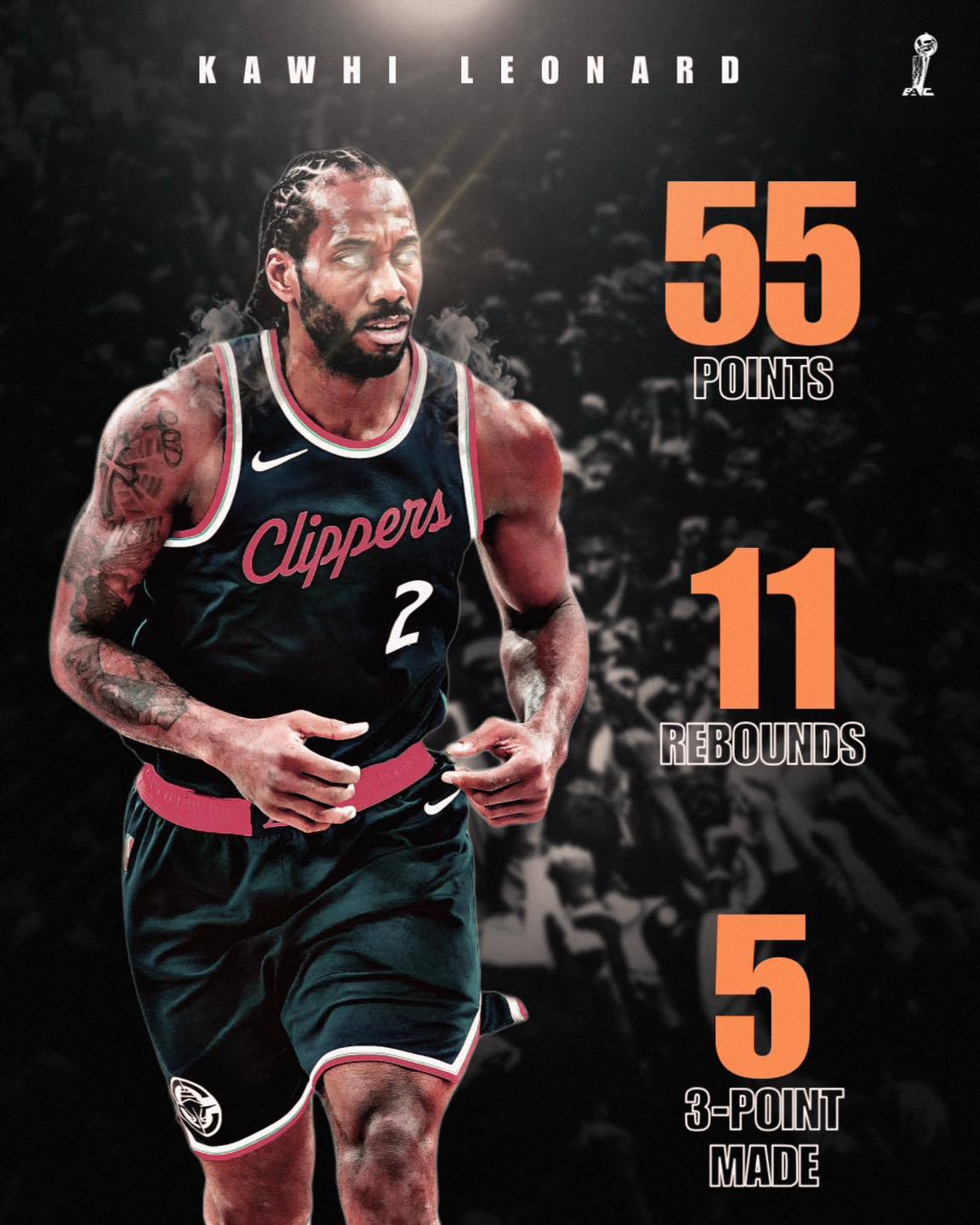 什么水平?!今天的伦纳德:——全场26中17,三分10中5,罚球17中16——拿下55分11篮板2助攻5抢断3盖帽——第三节单节26分——生涯首个50+——55分追平哈登保持的快船队史单场得分纪录——快船112-99大胜活塞,豪取四连胜活塞vs快船伦纳德巅峰一战快船4连胜