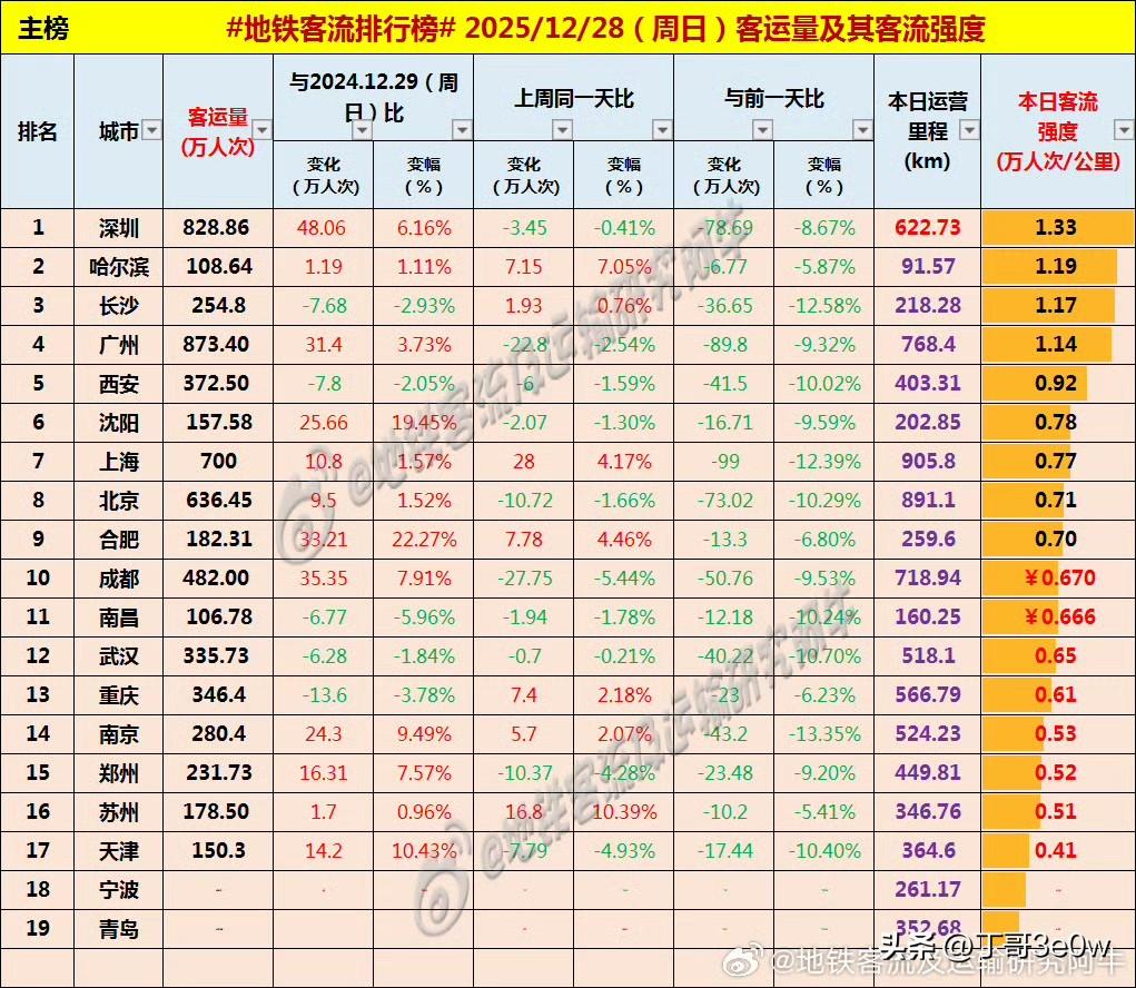 合肥地铁客流量周日继续领先于沈阳、天津和苏州,达182万人次之多[呲牙][呲牙][呲牙] 苏州地铁 天津地铁 2025年12月28日 星期天 全国重点城市轨道交通客流量排行榜: 广州:873.40万广州地铁 深圳:828.86万深圳地铁 上海:700.00万 北京:636.45万 成都:485.06万 西安:372.50万西安身边事 重庆:346.40万重庆身边事 武汉:335.73万武汉地铁 南京:280.40万南京地铁 长沙:254.80万长沙身边事 郑州:231.73万郑州爆料 合肥:182.31万 苏州:178.50万苏州地铁 沈阳:157.58万沈阳地铁 天津:150.30万天津身边事 青岛:100万+ 哈尔滨108.64万哈尔滨爆料 南昌:106.78万南昌地铁 宁波:100万+