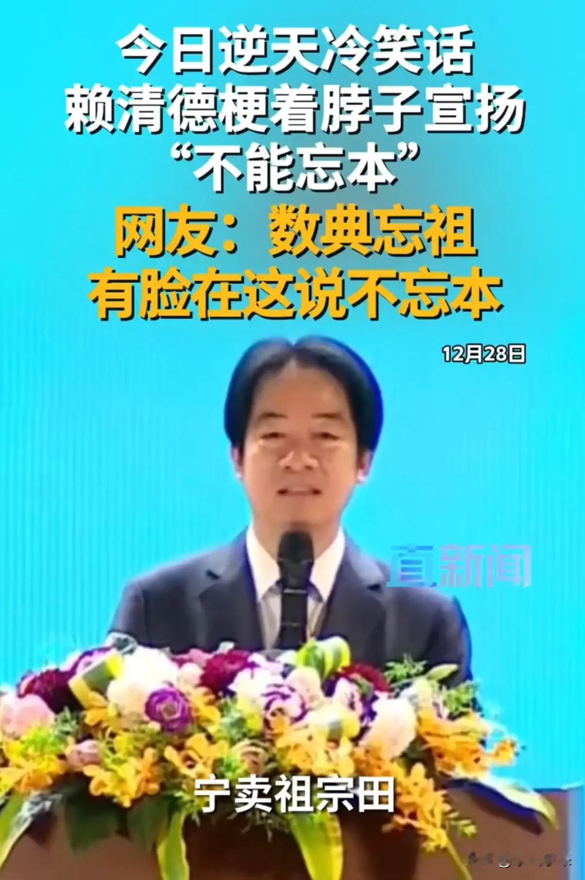赖清德既然说出“不能忘本” 正确回答应该是数典忘祖!赖清德因为自己的台独言论已经被赖家宗祠除名了! 你打脸不打脸!还说自己不是中国人,这会又说不能忘本!说白了,你是怕了吧!怕秋后算账! 赖清德也知道美国靠不住,日本更靠不住,自己“下台”以后天下之大没有容身之处,早晚会绳之以法! 况且言不由衷的话语,让人啼笑皆非!相信没有人相信赖清德的话! 前段时间媚日行为人神共愤,中国这次要动真格了,怕了,但是晚了!