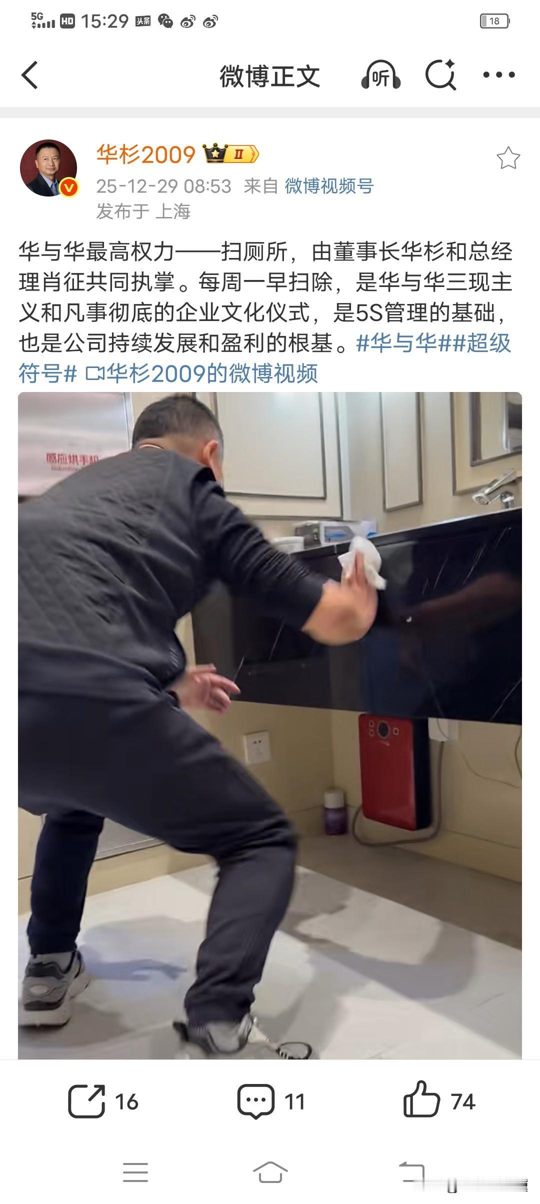 华与华的最高权力——扫厕所, 今天华山发布一个视频,视频的画面主要是他和总经理肖征扫厕所, 他附文字说,每周一的早扫除,是华与华三现主义和凡事彻底的企业文化仪式,是5S管理的基础,也是公司持续发展和盈利的根基。 这每周一的早扫除,成了文化仪式,成了公司管理的基础,还成了公司持续发展的根基, 我觉得这样的表述是不是故弄玄虚, 扫厕所本身是个非常小的事情,是个小事,保洁阿姨也能做的事,但是现在最高权力管理人员,公司的老总和公司的董事长两人共同执掌扫厕所,反差特别大, 是想通过这个反差特别大的事情来体现三现主义,体现做事彻底的规则要求吗? 但这种企业经营的规则要求并没有通过他们的咨询活动传递给他们所服务的企业, 贾总承认西贝在对外公开厨房实景时,发现了很多细节问题, 所以,作秀没用,扫个厕所有这么深刻的意义吗? 好好打磨公司的核心竞争力比作秀强太多,不是吗?