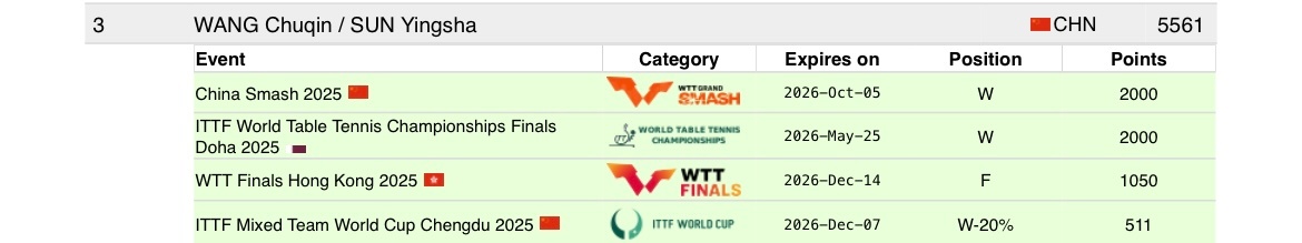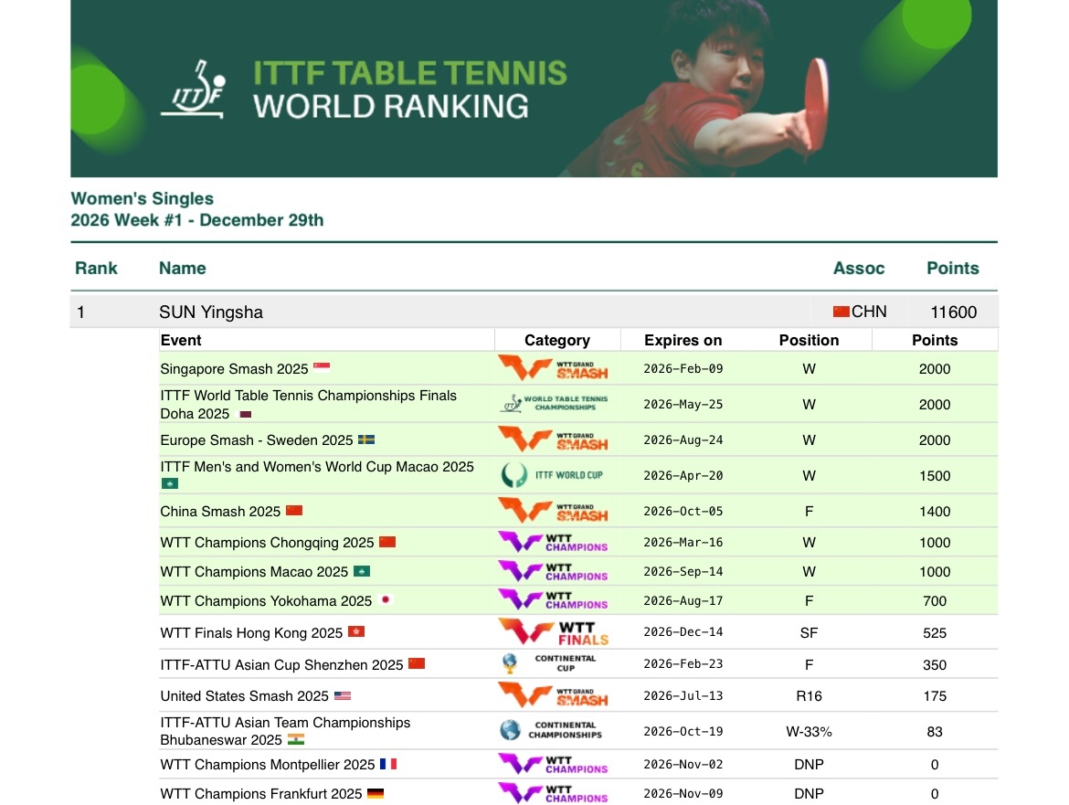 孙颖莎王楚钦莎头 20251229|2026年第1周世界排名更新女单世排第一男单世排第一混双世排第三颖莎棒楚钦棒莎头棒