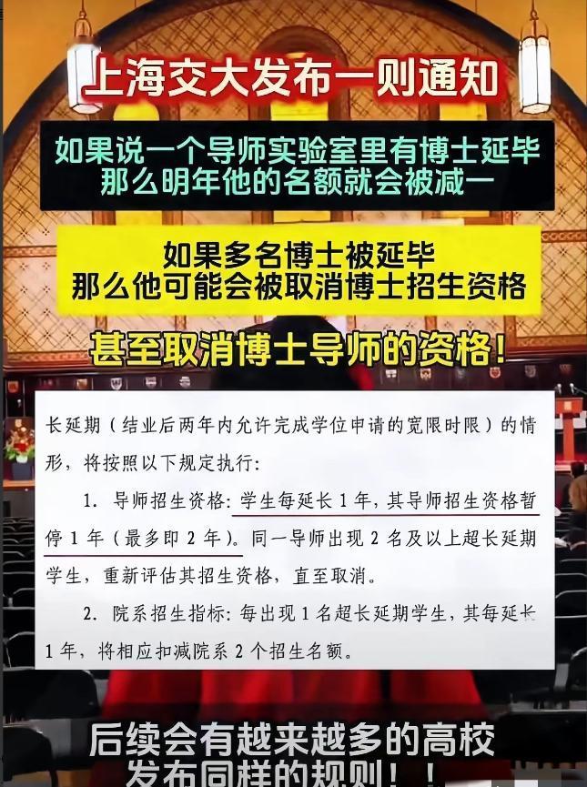 上海交大发了一则通告,把在校老师吓得一批! 这招太硬核:博士生延毕一年,导师来年停招;延毕两年,直接评估是否配带学生。 以前读博三年变四年,很多人还卡着毕不了业,真耽误人生! 就得这么治!导师不能再当甩手掌柜——要么别招,招了就得好好教,不能把学生当廉价劳力。 逼着老师认真选人、用心带,学生才能真学到东西按时毕业。 当然,硬核专业课题周期长,是不是也该区别对待?你觉得这政策该全国推广吗?