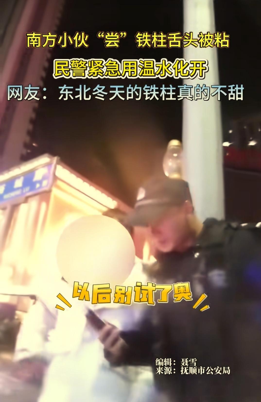 总有那不信邪的!辽宁抚顺,一对南方情侣来旅游,看到路边的电线杆后,男生说什么都要表演一下用舌头舔电线杆,结果不出所料,舌头直接被黏住,最后还是女友报警,附近的民警出手相助,这才帮助男生脱困 起初,女生随口提了一嘴,她在网上看过,冬天舔电线杆,舌头会被粘住。男生当成段子听,觉得这事多少有点夸张,非要现场验证一下。结果动作很快,后果也来得更快,舌头刚碰上去,人就僵住了,想撤已经来不及,只能含糊地呜呜出声 女生一开始还以为他在演,几秒后发现不对劲,急得直跺脚。她没经历过这种事,也不敢硬拽,只能报警求助 很快附近的民警赶到,男生还老老实实地贴在电线杆上,头不敢动,舌头不敢缩,场面说不上好笑,也确实挺遭罪。好在处理方法很成熟,温水往舌头上慢慢一浇,几秒钟就解开了,人也算平安脱困 类似情况在东北的冬天其实不少见。不少本地人小时候可能都因为好奇试过,或是被大人吓唬过。但真正长大了还往上舔的,多半是外地来的朋友 这背后的道理其实简单。金属导热快,冬天温度极低时,舌头表面薄薄一层唾液迅速结冰,就把舌头和金属冻在一起了。这时候千万别硬扯,不然真可能伤到皮肤。正确做法就是用常温水慢慢浇,让冰融化——不是热水,热水温差太大反而容易烫伤 旅行中最容易出问题的,从来不是没见过,而是觉得自己什么都懂。很多所谓的民间段子,能流传下来,往往都是真有人试过、真疼过。听劝这件事,有时候比胆子大更重要。出门在外,多一点敬畏,少一点逞强,真能少挨不少罪