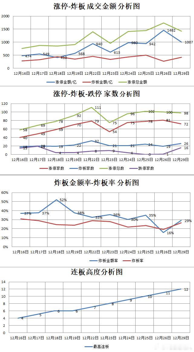 【12.29星期一】 湖南人涨停复盘 "涨停金额:1007亿 炸板金额:415亿首板金额:631亿 连板金额:376亿涨停72家 炸板26家 跌停16家首板54家 连板18家" 【市场连板股】18只 376亿 代码 名称 末次时间 连板数 原因001331 胜通能源 10:39 12 机器人002969 嘉美包装 9:25 9 公告002361 神剑股份 10:41 8 商业航天600783 鲁信创投 9:25 4 商业航天603278 大业股份 9:31 4 商业航天600118 中国卫星 14:52 4 商业航天002931 锋龙股份 9:25 3 机器人002652 扬子新材 9:47 3 半导体002347 泰尔股份 10:05 3 商业航天002009 天奇股份 13:37 3 机器人002471 中超控股 9:25 2 商业航天002591 恒大高新 9:30 2 电池产业链002691 冀凯股份 9:33 2 机器人002571 德力股份 9:51 2 商业航天600736 苏州高新 9:56 2 商业航天600759 洲际油气 9:58 2 海南000659 珠海中富 10:07 2 消费000547 航天发展 13:11 2 商业航天【商业航天】27只 610亿 消息面:商业火箭企业适用科创板第五套上市标准细化规则发布 002361 神剑股份 10:41 8 商业航天600783 鲁信创投 9:25 4 参股蓝箭航天603278 大业股份 9:31 4 商业航天600118 中国卫星 14:52 4 千帆星座002347 泰尔股份 10:05 3 商业航天002471 中超控股 9:25 2/4天3板 航空航天002571 德力股份 9:51 2/5天3板 翼元航空入主600736 苏州高新 9:56 2 商业航天000547 航天发展 13:11 2 商业航天+福建002187 广百股份 9:30 1 商业航天603017 中衡设计 9:33 1 商业航天000917 电广传媒 9:34 1 间接持股蓝箭航天002202 金风科技 9:49 1 参股蓝箭航天002146 荣盛发展 9:56 1 商业航天+海南002465 海格通信 10:01 1 卫星通信001266 宏英智能 10:16 1 商业航天002413 雷科防务 10:41 1 太空算力603458 勘设股份 11:23 1 北斗标准603116 红蜻蜓 13:00 1 商业航天600477 杭萧钢构 13:15 1 中标箭元火箭项目001229 魅视科技 13:44 1 商业航天600151 航天机电 14:39 1 航天八院(长征十二)600481 双良节能 14:42 1 SpaceX000987 越秀资本 14:44 1 投资中科宇航688523 航天环宇 14:45 1 千帆星座300751 迈为股份 14:50 1 太空能源605123 派克新材 14:56 1/3天2板 商业航天【机器人】14只 128亿 消息面: 行业独角兽迎来上市潮 001331 胜通能源 10:39 12 七腾机器人收购002931 锋龙股份 9:25 3 优必选拟入主002009 天奇股份 13:37 3 人形机器人(优必选)002691 冀凯股份 9:33 2 机器人003033 征和工业 11:04 1 合作七腾机器人603667 五洲新春 13:18 1 通过新剑供货T(传)301225 恒勃股份 13:29 1 机器人轻量化(PEEK材料)603192 汇得科技 13:29 1 聚氨酯树脂(机器人皮肤)001311 多利科技 13:30 1 机器人601113 华鼎股份 13:36 1 机器人材料(尼龙)688160 步科股份 13:45 1 机器人688090 瑞松科技 14:38 1 机器人000700 模塑科技 14:45 1 人形机器人603879 永悦科技 14:54 1/4天2板 机器人(福建)【半导体】7只 95亿 002652 扬子新材 9:47 3 半导体洁净室605255 天普股份 10:09 1/3天2板 中昊芯英(TPU)603353 和顺石油 10:22 1 拟控股奎芯科技002169 智光电气 13:44 1 间接参股粤芯半导体【算力相关】 002272 川润股份 9:30 1 华为(鲲鹏、昇腾)605168 三人行 10:53 1 算力002261 拓维信息 13:06 1 华为昇腾603936 博敏电子 13:54 1 PCB【电池产业链】3只 28亿 002591 恒大高新 9:30 2 钠离子电池603876 鼎胜新材 10:44 1 钠电铝箔603778 国晟科技 14:26 1 锂电池【碳纤维】3只 16亿 消息面:日本东丽宣布自明年1月起上调碳纤维及其中间产品价格 000420 吉林化纤 9:38 1 碳纤维涨价301237 和顺科技 9:39 1 碳纤维涨价603332 苏州龙杰 9:39 1 碳纤维涨价【其他热点】 002969 嘉美包装 9:25 9/17天9板 控制权变更(追觅科技) 605086 龙高股份 9:33 1 紫金矿业拟增持 600759 洲际油气 9:58 2/6天3板 海南000048 京基智农 13:27 1 海南002177 御银股份 13:04 1 数字人民币603123 翠微股份 14:39 1 数字人民币000659 珠海中富 10:07 2 消费600828 茂业商业 13:34 1 消费【其他个股】 002072 凯瑞德 9:36 1 煤炭600178 东安动力 9:48 1 汽车产业链601700 风范股份 9:49 1 唐山国资入主605069 正和生态 9:52 1/4天2板 智谱AI001335 信凯科技 10:42 1 汇率受益001217 华尔泰 11:10 1 烟花600506 统一股份 14:31 1 统一名字600058 五矿发展 14:54 1 小金属300582 英飞特 15:00 1 植物照明【涨停炸板】26只 415亿 代码 名称 首次时间 涨跌幅 原因688585 上纬新材 13:30 20.00% 机器人300877 金春股份 9:56 12.05% 商业航天605090 九丰能源 10:03 10.01% 商业航天000863 三湘印象 9:32 8.53% 其他002104 恒宝股份 14:14 8.31% 数字人民币600955 维远股份 9:55 8.03% 其他002052 同洲电子 13:02 7.95% 东数西算/算力002674 兴业科技 9:33 7.86% 机器人603186 华正新材 9:32 7.83% 半导体002163 海南发展 10:15 7.78% 海南000973 佛塑科技 13:57 7.24% 锂电池002716 湖南白银 10:12 7.22% 其他601212 白银有色 10:12 6.30% 其他603008 喜临门 10:30 6.16% 其他002865 钧达股份 10:03 5.70% 商业航天002866 传艺科技 9:35 4.96% 电池产业链603386 骏亚科技 11:02 4.37% 机器人605155 西大门 11:21 3.99% 大消费600231 凌钢股份 9:30 3.29% 国企改革003027 同兴科技 9:30 3.12% 锂电池601969 海南矿业 9:33 3.09% 海南603898 好莱客 10:24 3.02% 大消费603608 天创时尚 9:25 2.16% 公告600807 济高发展 9:31 1.52% 医药002870 香山股份 10:51 1.23% 机器人600858 银座股份 9:31 -1.88% 大消费