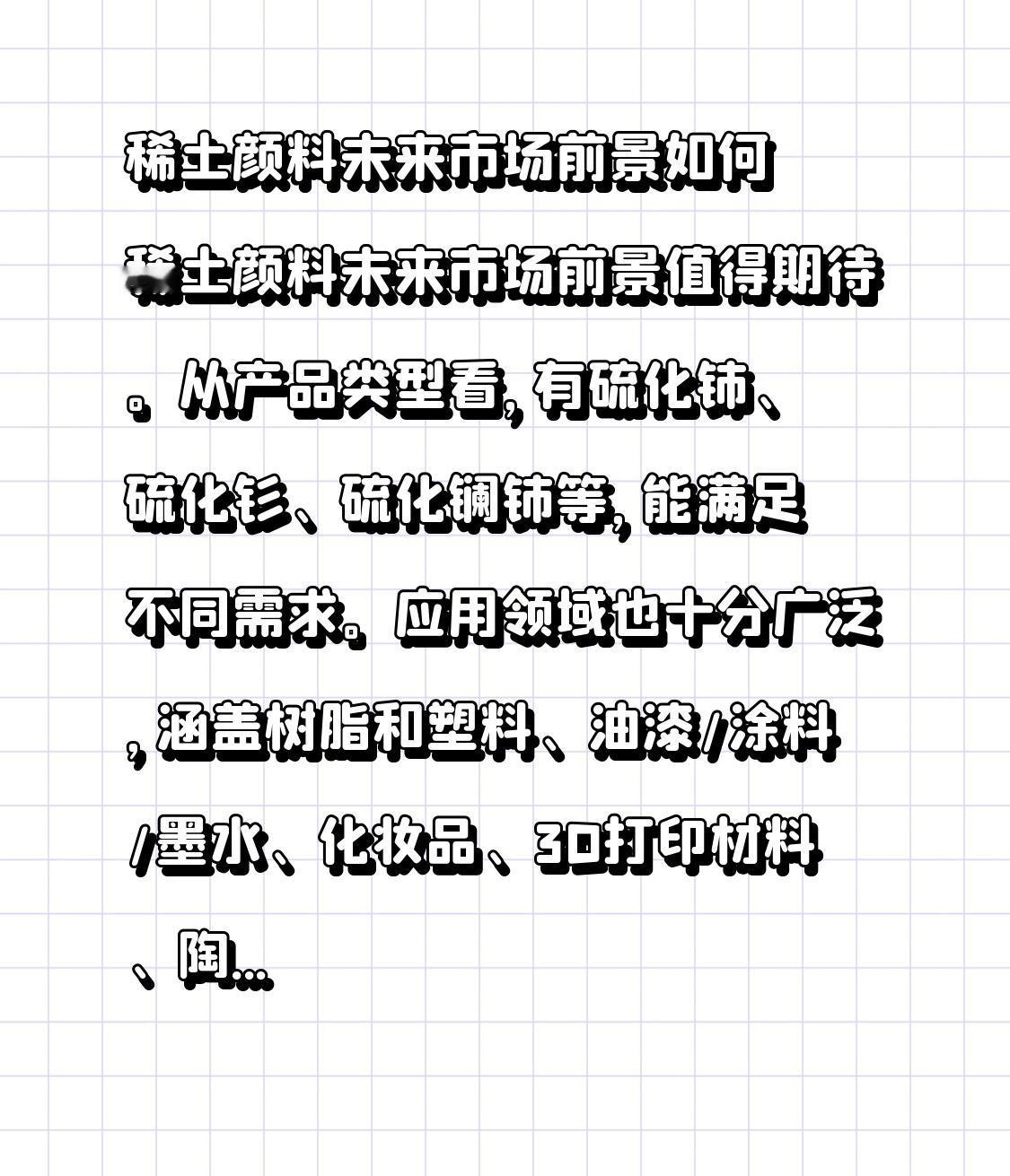 稀土颜料未来市场前景如何稀土颜料未来市场前景值得期待。 从产品类型看,有硫化铈