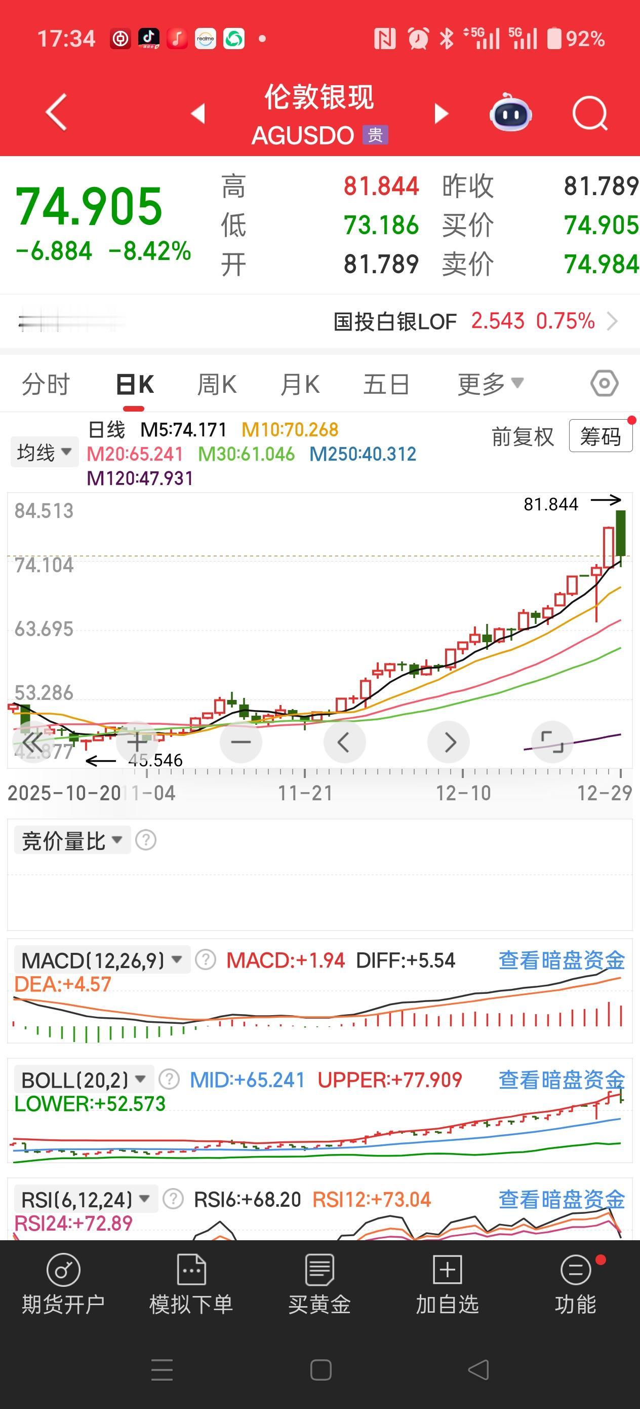 注意!注意!巨大风险! 受上周五晚伦敦银现货大涨影响,早盘白银有色封板,后来下午破板了,最后收涨6.3%。 今天散户要是追进去的可就危险了! 大a收盘后,伦敦银现货还在跌,到现在17:35分,跌幅达到8%之多了。 明早大a开盘,白银有色肯定也会低开了。 小心啊,散户朋友们,做好风控啊。 白银持续逼空的行情是不可持续的,只能做超短,千万别格局!