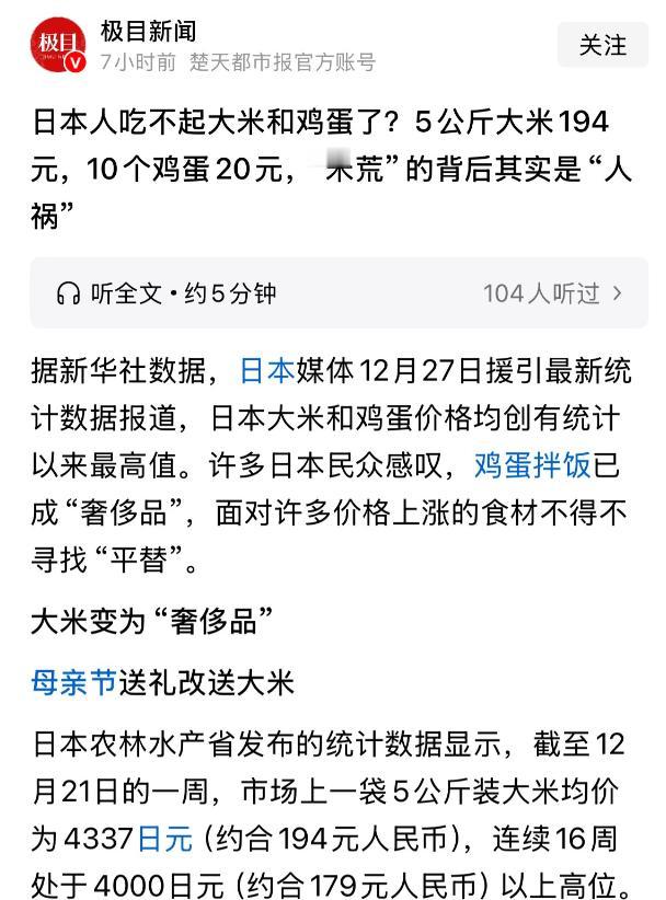 新华社数据日本人吃不起大米和鸡蛋了?   日本超市货架上,5公斤装的大米,标价194元人民币左右。再看鸡蛋,10个一盒的鸡蛋,要卖20元人民币。   很多日本家庭主妇直接“破防”,网上哀嚎“鸡蛋饭都吃不起了”。别说日式盖饭、便当了,连最普通的白饭配鸡蛋,都成了“奢侈享受”。   要知道,日本人对大米和鸡蛋的感情,跟咱中国人差不多。早上来碗米饭,配个生鸡蛋拌一下,撒点酱油:这可是日本“国民级早餐”之一。   现在可倒好,大米和鸡蛋都涨成这样,普通老百姓的钱包直接“吃不消”。对于为什么大米和鸡蛋这么贵,日本官方也出来“背书”了。   理由很“官方”:去年夏天极端高温,水稻减产;疫情之后旅游业火了,餐饮业对大米的需求猛涨,导致价格上去了。   这种说法听起来好像有点道理,但日本老百姓和不少经济学家真不买账。天气热,水稻减产,这事年年有,也不是头一回。   旅游业复苏,难不成一夜之间就把大米吃断货了?大家心里都明白,这都是“表面功夫”,实情可远没这么简单。   想明白日本大米、鸡蛋为啥涨价,不能只看天灾和游客。其实背后的“人祸”,才是最扎心的。   就像日本著名经济学家高桥洋一说的,这波“米荒”,根子在日本几十年推行的农业政策上。有人可能要问了,日本农业不是科技很发达吗?怎么还闹米荒?   这事要往前倒到1971年。那年,自民党首相佐藤荣作拍板搞了个“减产政策”。啥意思?就是为了控制大米价格,政府鼓励农民少种点,甚至直接给补贴,“不种田也能拿钱”。   看起来是保护农民,其实是把大米变成了“稀缺资源”。这就像把米缸的盖子盖得死死的,但有一天突然家里来客人,米缸根本不够用,价格蹭蹭往上冒。   说白了,“减产政策”就是把大米当成“战略物资”来管理。政府怕大米太多,价格掉下去,农民收入受影响,于是宁愿让田地荒着,也不让农民多种。   日本农村很多地现在都“抛荒”,年轻人也不愿意种田。时间一长,遇上极端天气、需求增加,大米供应链一下就绷紧了。   再加上各种流通环节的“环节费”,超市、批发商、中间商,层层加价,最后苦的还是普通人。你说,这不就是“人为的米荒”吗?   日本鸡蛋以前一直被称为“平民食物”,便宜又营养。但这几年,蛋价也是一路飞涨。有人调侃,日本的鸡蛋快成“金蛋”了。其根子也和农业体制脱不开关系。   日本蛋鸡养殖场多是家族企业,规模不大,抗风险能力弱。疫情一来,饲料涨价、运输成本高,很多小养殖户干脆关门大吉。   有些地方还闹禽流感,鸡都杀了,蛋就更贵。最关键的,是日本对食品安全要求高,进口鸡蛋门槛一高,国内蛋一紧张,价格就飞天。   从表面看,是大米鸡蛋涨价,实际上,日本社会的“深层病根”也暴露无遗。农业人口老龄化严重,农村“空心化”,年轻人都跑去城市打拼,田没人种,养鸡场没人接班。   政府几十年不敢动“减产政策”,怕得罪选票,结果就是农田荒着,产量低下。更要命的是,日本社会“保守惯性”太强。政策一旦定下来,想改比登天还难。   哪怕问题摆在眼前,大家也只是互相推诿,没人愿意拍板。再加上国际局势变动、能源和饲料价格上涨,日本的“食品安全”越发脆弱。   咱中国的情况就格外值得自豪了。你看,无论是大米还是鸡蛋,咱中国几乎是自给自足。遇到天灾人祸,咱中国总能稳住粮食供应,老百姓锅里永远有饭有蛋。   尤其这几年,咱中国对农业扶持越来越到位,种田人有盼头,农村发展有劲头。哪怕有时候物价小幅波动,整体来说,想饿着肚子还真不容易。   不少网友调侃:“日本大米、鸡蛋吃不起,咱中国农民赢麻了!”这话虽然夸张,但也不是没道理。粮食安全,说到底就是国家安全。咱中国老百姓能吃饱、吃好,就是最大的幸福。   日本今天的“米荒蛋贵”,其实是前车之鉴。咱中国一直把粮食安全当头等大事,这种心态,必须保持。   咱中国的“饭碗工程”不是嘴上说说,而是真刀真枪去抓。农田保护、农民补贴、科技农业,这些年一环接一环,就是为了让咱自己的主食不被别人卡脖子。   想想看,要是哪天咱中国也像日本那样,主食成了奢侈品,那可真是“笑都笑不出来”了。所以,今天咱还能吃上便宜的大米和鸡蛋,真得感谢那些默默种田养鸡的劳动者。   咱中国要吸取教训,把饭碗端得更牢。别小看一碗米饭、一颗鸡蛋,这背后是国家的底气、老百姓的幸福。日本人今天吃不起主食,咱中国人要更加珍惜锅里的每一口饭。   只要咱中国把农业抓紧、把农民照顾好,主食永远不会成为“奢侈品”。说到底,吃饱饭才是硬道理。日本的“米荒蛋贵”,是个警钟,咱中国得一直把“饭碗”放在心头。 参考资料: 《日本人吃不起大米和鸡蛋了?5公斤大米194元,10个鸡蛋20元,“米荒”的背后其实是“人祸”》——极目新闻