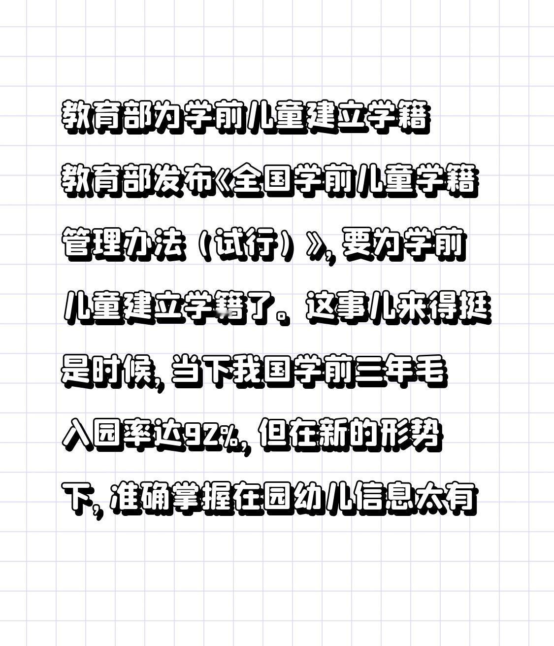 教育部为学前儿童建立学籍 教育部发布《全国学前儿童学籍管理办法(试行)》,要为学前儿童建立学籍了。这事儿来得挺是时候,当下我国学前三年毛入园率达92%,但在新的形势下,准确掌握在园幼儿信息太有必要了。 这个办法规定得挺细致,明确了管理定位、体制、流程和保障措施。学前儿童入园就有专属学籍号,小学接着用,还“籍随人走”。这能保障孩子受教育权益,也能规范幼儿园办学。以后学前教育资源配置会更优化,财政补助政策也能精准实施,为学前教育高质量发展打了一剂强心针。
