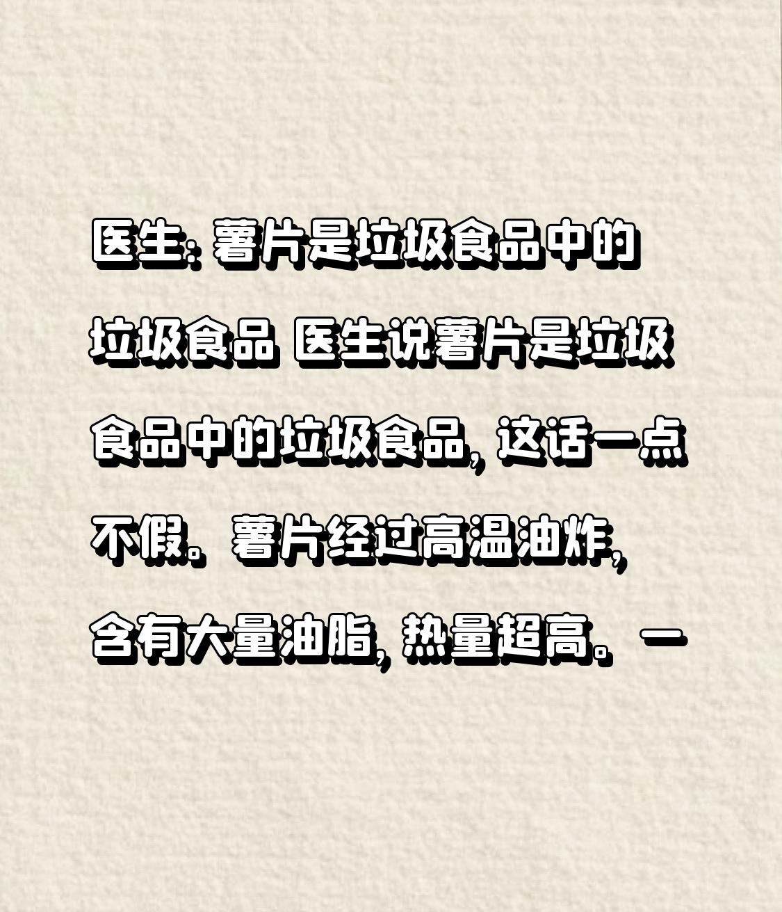 医生:薯片是垃圾食品中的垃圾食品 医生说薯片是垃圾食品中的垃圾食品,这话一点不假。薯片经过高温油炸,含有大量油脂,热量超高。一包100克的薯片,热量能达到500大卡左右,相当于好几碗米饭。而且为了提升口感,会添加大量盐和各种添加剂。 我之前有段时间狂吃薯片,每天好几包,结果没几天体重就蹭蹭往上涨,脸上还疯狂冒痘。后来听医生的话戒掉薯片,身体状态才慢慢好起来。咱还是得管住嘴,少吃这种“垃圾中的战斗机”。