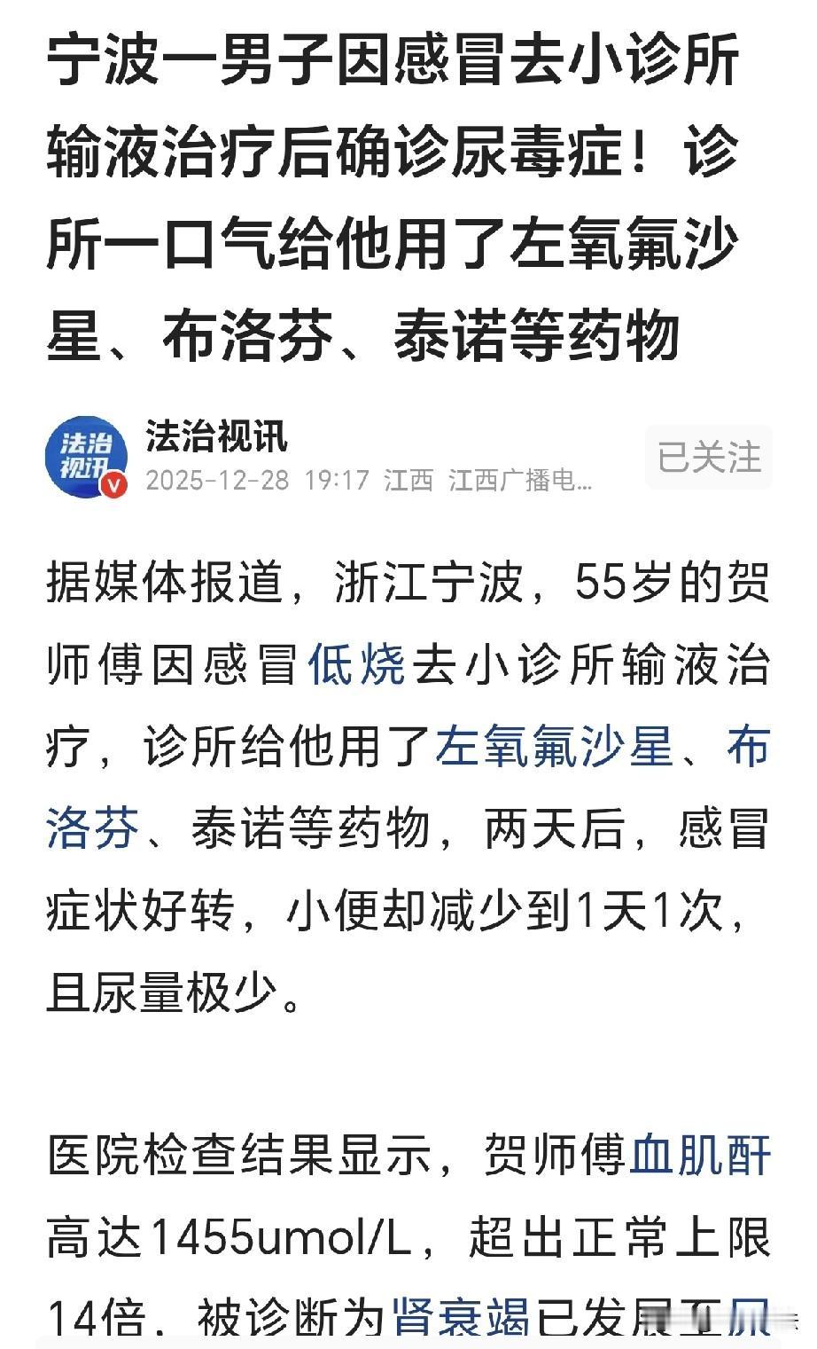 太吓人了!浙江宁波,一55岁男子感冒,他一量体温,自己有些低烧,他到小诊所输液治疗,诊所一口气给他用了左氧氟沙星、布洛芬、泰诺等多种药物,男子感冒好转,可他惊讶的发现,自己小便减少,一天只有一次,男子到医院一查,被诊断为肾衰竭,已经发展成尿毒症了,医生说了番话,令他后悔莫及。 贺师傅已经55岁,他依然在为生活奔忙,他早出晚归,经常会累的满头大汗。 可是最近天气寒冷,他一不小心就着了风寒,他头晕脑涨,急忙回到家里休息。 他喝了些热水,打算睡上一觉,也许感冒就能好了,他合衣躺下,谁知越睡越觉得难受。 他头疼欲裂,昏昏沉沉,他不放心,拿起体温计夹到胳膊下面。 他等了片刻,拿出一看,坏事了,怪不得自己头疼,原来他已经发起了低烧。 贺师傅急着上班,他希望自己的身体能够尽快的恢复。 于是他起身来到附近一家小诊所里,诊所的大夫给他输液治疗。 为了缓解他的疼痛和炎症,诊所医生一口气给他使用了好几种药物。 贺师傅大概一看,那几种药非常的常见,有消炎用的左氧氟沙星,还有布洛芬,这他知道,布洛芬可以降温止痛。 医生又给他使用了泰诺,几种药联合使用,这样就能让他尽快的恢复。 没过一会儿,贺师傅感觉脑袋似乎没那么痛了。 之后他在诊所里继续治疗,他挂着点滴,药水一点点进入了贺师傅的身 体。 诊所的治疗很有效果,他输液了两天,感冒症状就有了很大的好转。 贺师傅心里高兴,按照这样的速度,他很快就能恢复,然后就能继续工作。 可是他突然发现,尽管输了那么多药水输了进去,可是他的小便却不正常了。 他一天只有小便一次,而且这一次的尿量极少,这肯定又是哪不对劲了,贺师傅心里紧张了起来。 他立刻来到了大医院里,医生给他做了全面的检查,可检测结果出来,贺师傅顿时傻眼了。 化验单上显示,贺师傅的血肌酐竟然高达1455umol/L。 这个数字,比正常值高了14倍,医生摇了摇头,贺师傅吓得腿都软了。 医生诊断,贺师傅的肾上出现了问题,他肾脏衰竭,已经发展成了尿毒症了。 贺师傅眼前一黑,尿毒症他可知道,严重时会危及生命。 可是他就奇了怪了,之前他的身体没什么大的问题,他已经年过半百,小毛病肯定也是有的。 但是这肾衰竭尿毒症也太突然,在这之前,他从未出现过这样的问题。 贺师傅转而一想,他是在小诊所输液之后才出现了小便减少的症状,难道诊所的用药有问题? 他百思不得其解,自己感冒,输液后确实症状已经减轻,这就证明,医生治感冒发烧的药用的是对的。 可是,难道说这药有副作用吗?贺师傅赶忙把这两天的遭遇告诉了医生。 医生摇了摇头,那就怪不得会出现了肾部的损伤。 医生给贺师傅解释,布洛芬和泰诺这两个药物,它们都含有非甾体抗炎药的成分。 这种成分,能够快速的解热镇痛,消除身体的炎症。 可尽管如此,这类药的副作用却不可忽视。 如果不注意用量,或者联合用药,那么就会在抗炎镇痛的同时,却给肾脏造成巨大的伤害。 也就是说,这两种药可能会导致急性肾损伤。 之后,医生对贺师傅又进行了肾部的穿刺,对他的病理做了进一步的检查。 果然不出医生所料,贺师傅的肾脏出现衰竭,正是由于药物的副作用引起的。 如今贺师傅已经是急x肾损伤,他后悔莫及,当初的感冒发烧,不该去小诊所输液。 如果及早就去正规医院治疗,肯定不会是现在的结果。 大医院的医生护士查房时都会询问病人每一天的大小便情况,一旦发现不对,立刻就会做出应对的措施。 肾衰竭能够发展到尿毒症,肯定期间会有相应的症状,医生会在第一时间做出反应。 而这种联合用药,只会在病人高烧和炎症很厉害的情况才会使用。 但凡单一类药品能抗住病症,医院不会多加一种药品。 如果是使用正常剂量的药物,即使是联合使用,也不可能在这么短时间的时间内就出现尿毒症。 即使有一定的关联,那也说明患者刚好是有肾功能不全的基础疾病,恰好因为输液加重。 如果去正规的医院,医生会先给你抽血检查,如果是有基础疾病,医生会考虑其他治疗方案。 医生也会定点针对清除病症,该给你用多少就用多少,绝不会一次使用大剂量的药物。 怕就怕小诊所是超倍的使用,那后果肯定就会十分的严重。 可也有人认为,大医院费用真贵,光检查费都要好几百元,然后再开两三百的药。 就怕农村或者普通人觉得有经济压力,不愿去医院,怕多花钱,从而耽搁了最佳的时期。 可孰轻孰重? 《民法典》第1221条规定: 医务人员在诊疗中未尽到与当时的医疗水平相应的诊疗义务,造成患者损害的,应当承担赔偿责任。 小诊所医生对含同类成分的布洛芬与泰诺联合用药,未评估肾损伤风险,也未先做基础检查,违反诊疗规范。 如果确定贺师傅的尿毒症与不当用药存在直接因果关系,小诊所需要承担赔偿责任。 对此,你怎么看?欢迎评论区留言讨论。 关注@王哥说法 多学法律少吃亏!