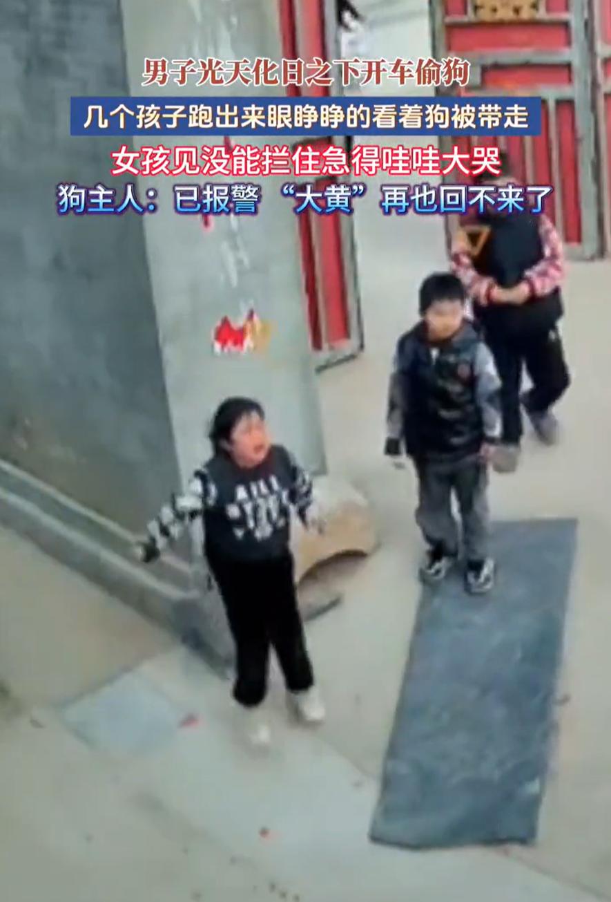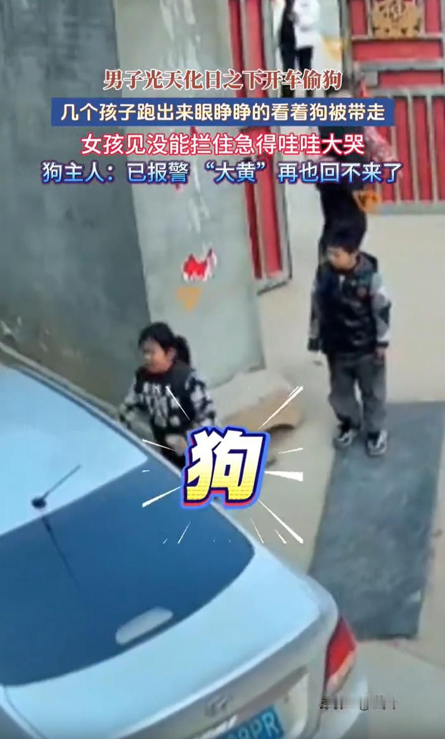 这也太嚣张了!河北,一男子光天化日之下,直接在别人家门口偷狗,家里的孩子眼睁睁看着家里的“大黄”被人抱上车,急得直跳脚,虽然家长第一时间报了警,但她也坦言:“狗大概找不回来了”。网友:全网都看到车牌号了 监控显示,当时大黄就在家门口老老实实的趴着,几名孩子正好在院子里玩耍,一辆车缓缓停在路边。一个男人下车,径直走向大黄。动作干脆利落,他弯腰抱起狗,转身,拉开后车门,把狗扔了进去。整个过程中,大黄甚至没来得及叫一声 院子里的女孩第一个反应过来。她冲出来,嘴里喊着“狗!狗!”但车子已经启动。她追了几步,眼睁睁看着那辆车带着她熟悉的大黄消失在路尽头。女孩停了下来,在原地边哭边跳,那种无助的着急,隔着屏幕都能感受到 监控视频在网上传开后,网友们最气愤的是,车牌清清楚楚被拍了下来,光天化日之下,偷狗人竟如此嚣张,但愤怒之余,也有一种深深的无力感,这样明目张胆的偷盗,真的能受到应有的惩罚吗? 一条看家护院多年的狗,对许多人来说只是“财产损失”中的一个数字,但对那个追出来的女孩来说,可能是陪伴她长大的伙伴 很多人会说以后得把狗拴好,看紧点。话没错,却不该成为唯一的结论。正常的生活状态,本就不该建立在时时提防别人作恶的前提上。狗趴在自家门口,本身不是错误 我们常说“盗亦有道”,但这些人连最基本的底线都没有,他们不在乎是否被孩子看见,不在乎给一个家庭带来什么样的创伤。他们眼中只有利益,没有良知。希望这次能把这个人抓到,也算对这个小女孩一个交代 男子光天化日开车偷狗 女孩急得大哭