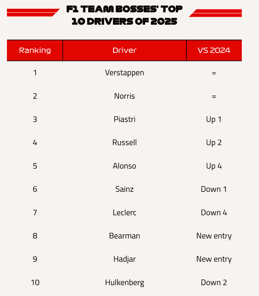 10位车队领队分别选出了个人心目中2025赛季F1十大车手,1-10名分别获得25-18-15-12-10-8-6-4-2-1得分,总计得出最终排名。维斯塔潘连续第五年被车队领队评为当年最佳车手,诺里斯和皮亚斯特里分列二三。两位新秀车手贝尔曼和哈贾尔上榜,排名第八和第九位。f1