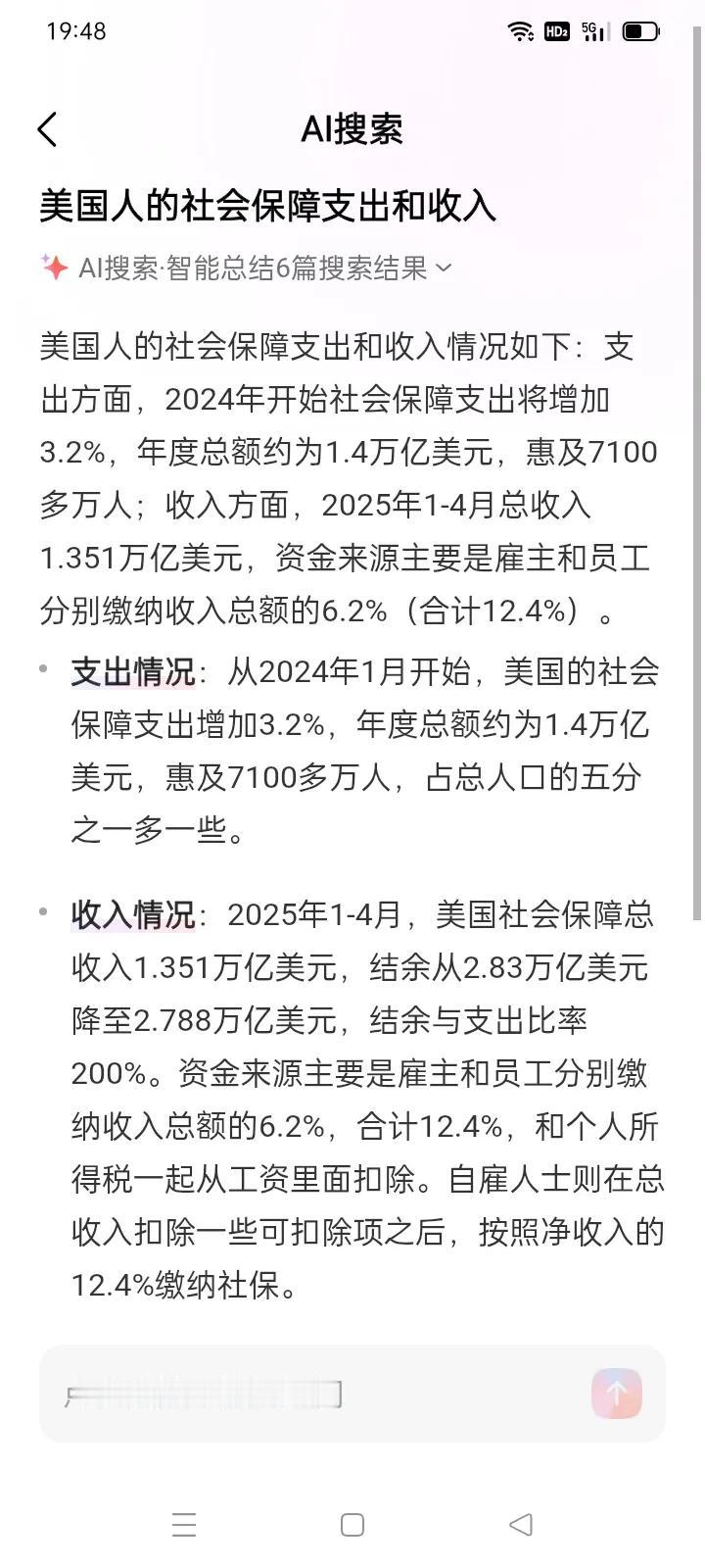 美国‘斩杀线’究竟如何? *这两天,所谓的美国斩杀线火了! 有人说大多数美国人拿不出400美元备用金!美国很多的中产阶级和普通人每月入不敷出!他们背负着比较沉重的债务,必须辛勤工作、来供养居于统治地位的大财阀! *美国人真的这么惨吗?我表示质疑。 1最近特朗普宣布向全体美国人每人发放2000美元的关税红利!而且另外向美国军人每人发放1776美元的关税红利! 疫情期间美国政府分别三次向美国人发钱,成年人收到3200美元,16岁以下者收到2500美元。(高收入者除外) 2众所周知,近年来波音公司和福特公司的以及港口员工进行了大罢工,并且在工会和政府的支持下,他们的薪酬待遇获得了大幅度提高! 3网上说美国某个童星及年薪百万的软件工程师流落街头了。这是事实,但是我们绝不能以偏概全地夸大美国斩杀线的社会危机! *特朗普为什么严厉地大规模地驱逐外来移民?就是因为这些人抢了普通美国人的饭碗! 美国为什么物价相对稳定?(据说一分钱面值的硬币还在使用)就是因为中国为美国贡献了数不胜数的物美价廉的优质商品! 当然了,社会等级的金字塔就是从上到下地剥削剩余价值的!美国的大资产阶级统治者们肯定对于社会中下层进行着政治压迫和经济剥削! 但是美国人的生活水平在全球范围之内,还是相当好的!去年美国的社会保障支出是1.4万亿美元。 今年前四个月,美国社会保障收入为1.35万亿美元,结余高达近2.8万亿美元!而美国人的社会保障缴费比例是个人和雇主分别缴纳6.2%,并不高!