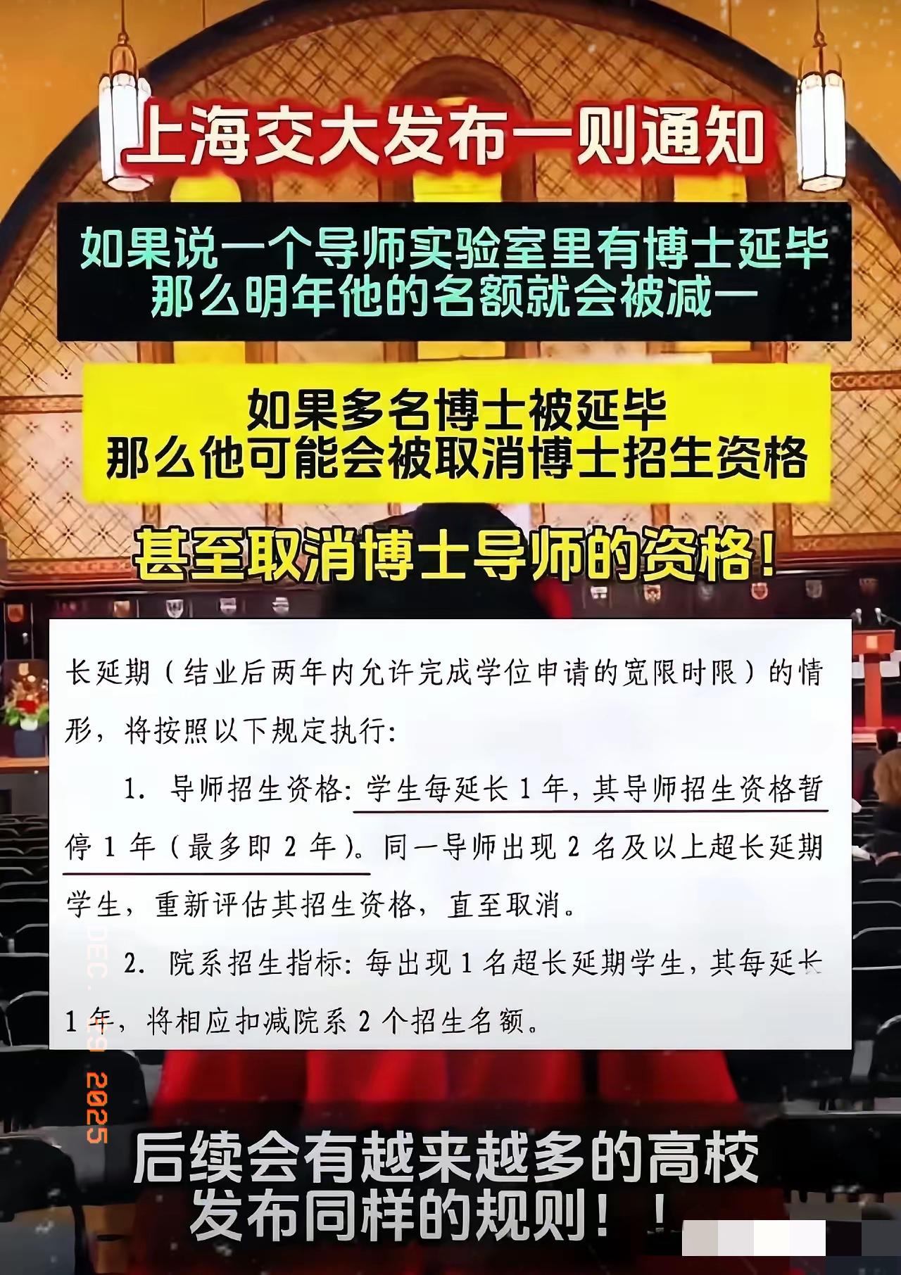 上海交大发了一则通告,把所有的在校老师吓得一批,因为通告说,博士生每延长一年,来年这位导师的招生资格就停招一年,如果两年停招,那么就要评估这位老师是否适合招收学生了,可能要停止他的博士生导师招生资格。 这消息一出来,学术圈里讨论得可热闹了。很多人说,这下导师们的压力直接拉满了,毕竟招生资格和自己的“学术产出线”——博士生能不能按时毕业——彻底绑在了一起。 学校动真格出台这么严的规定,背后有个大背景:博士生规模越来越大了。有数据显示,上海交大计划到2026年招收5000名博士生。而今年学校的本科新生人数大约是4995人。这意味着,明年该校的博士生人数在历史上首次超过本科生,形成一个“倒挂”现象。这不仅是交大一家的趋势,放眼全国,博士扩招的步伐也很快。 规模上去了,培养质量就成了重中之重。博士生延期毕业,过去有时被默认为常态,但现在学校明确释放信号:这不行。新规就像一把“达摩克利斯之剑”,悬在导师头上,督促他们必须对学生的培养过程投入更多精力,加强全过程指导,不能“放养”。其核心目的,就是为了倒逼培养质量的提升,防止博士学历“注水”。 这个规定的影响是双面的。对认真负责的导师和勤奋的学生来说,是个利好,营造了更重视效率的学术环境。但压力也可能层层传导。导师在招生时或许会更谨慎,甚至可能更倾向于选择短期内容易出成果的课题,而那些需要长期“坐冷板凳”的基础研究,会不会受到影响?这成了许多人心中的疑问。 说到底,博士培养的核心是“育人”而非“用工”。将导师招生资格与学生延期毕业直接挂钩,是一项强有力的管理措施。但衡量一位好导师的标准,远不止学生是否按时毕业这一条。如何在执行刚性规定的同时,保护学术研究的多样性和探索自由,避免急功近利,可能是政策落地后需要持续观察和平衡的难题。 各位读者你们怎么看?欢迎在评论区讨论。