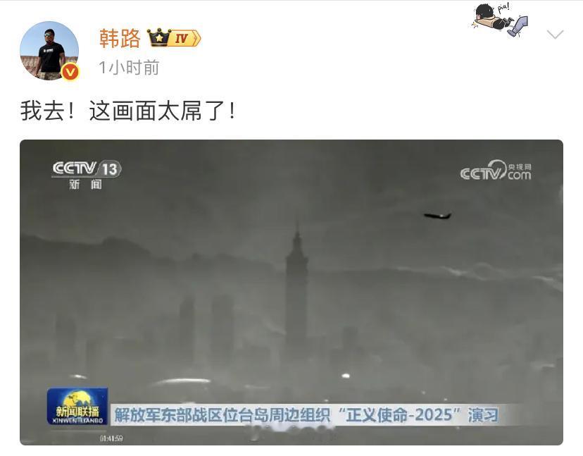 韩路:我去!这画面太屌了! 背景中是台北知名的101大厦,101大厦设在台北的市中心,这么近的距离能拍摄到101,也就说明飞机飞得非常近了,此前飞机发布的都是台湾山脉的图片,现在直接发布城区的图片。 希望有越来越多的好消息,各位是怎么看的?欢迎评论区留言。