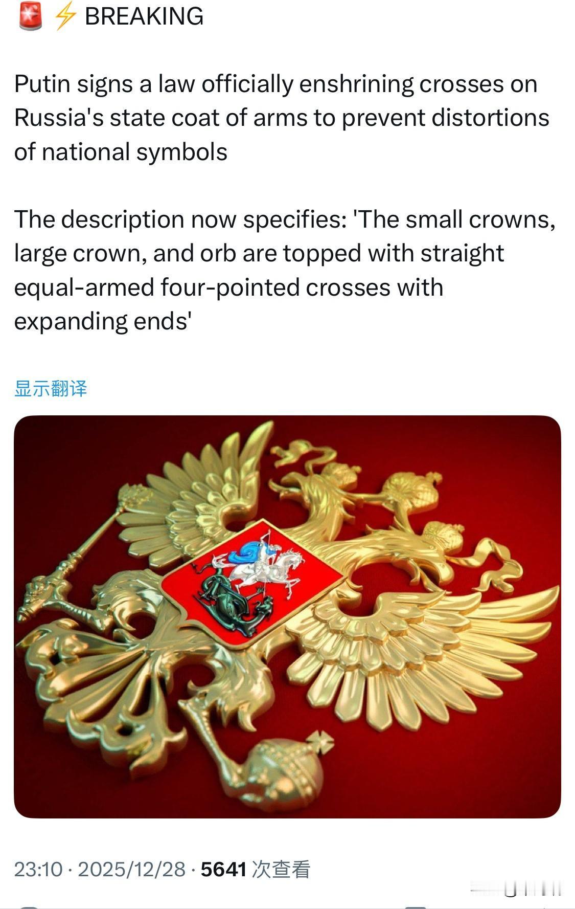 突发新闻:普京签署法律,正式将十字架纳入俄罗斯国徽,以防止国家象征遭到歪曲。 法律描述现在明确指出:“小皇冠、大皇冠和球体顶部都饰有末端呈展开状的等臂四角十字架”。 俄罗斯国徽中的双头鹰象征着俄罗斯地跨欧亚两大洲,权杖和宝球则象征着国家统一和神圣不可侵犯的权力,这些都是历史悠久的国家象征。 国徽上的十字架与俄罗斯正教十字架的样式存在直接关联,圣安德烈勋章上也雕有十字架图案。