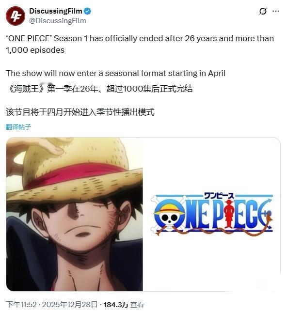 外媒:海贼王第一季1000多集今日完结! 国外媒体这两天大量用这样的模式来报道海贼王动画蛋头岛篇的结束。 “1000多集的海贼王动画第一季在2025年正式完结,2026年起将以季播形式播出。”好家伙1000多集一季是吧。