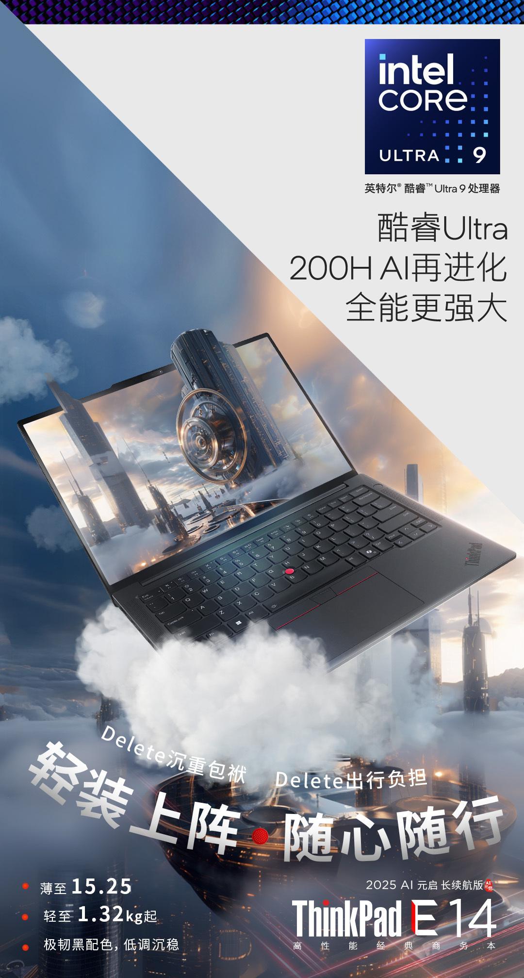 谁懂啊!之前背笔记本像扛了块砖,现在有了 ThinkPad E14—— 带酷睿 Ultra 9 处理器(200H AI 能力超顶),薄 15.25mm 轻 1.32kg,极韧黑还贼有质感,“沉重包袱” 直接 Delete,出门轻装上阵不要太爽!酷睿Ultra 酷睿UltraAI更强谁不爱 黑fun礼 一起了不起 ThinkPad