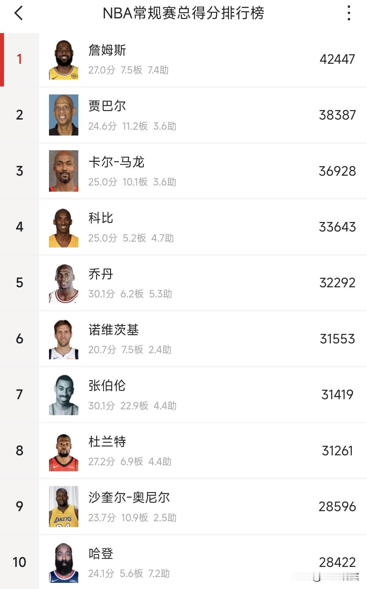 真的被有些黑粉蠢哭了,因为今天我发表30000分不一定能进NBA历史前十(常规赛总得分)的言论引起大家热议,现在我们来一起按数据分析下。 现在历史第十是哈登有28422分,现在可以肯定哈登(无论是短腿还是赛季报销,有些不怀好意的极端分子)拿30000分没问题吧,这个争议还有吗? 也就意味着奥尼尔可能在下个月就排名第十没有问题,就看后面的球员,只有这一个名额,超过奥尼尔之后就是历史第十的门槛(可以和哈登交换),无论是库里还是威少,或者以后的字母哥(刚满31岁),甚至德罗赞,他们都是历史第十的有力竞争者,这些人都能超过奥尼尔吧。 你们觉得NBA历史前十(常规赛)总得分为30000分还不可能吗?