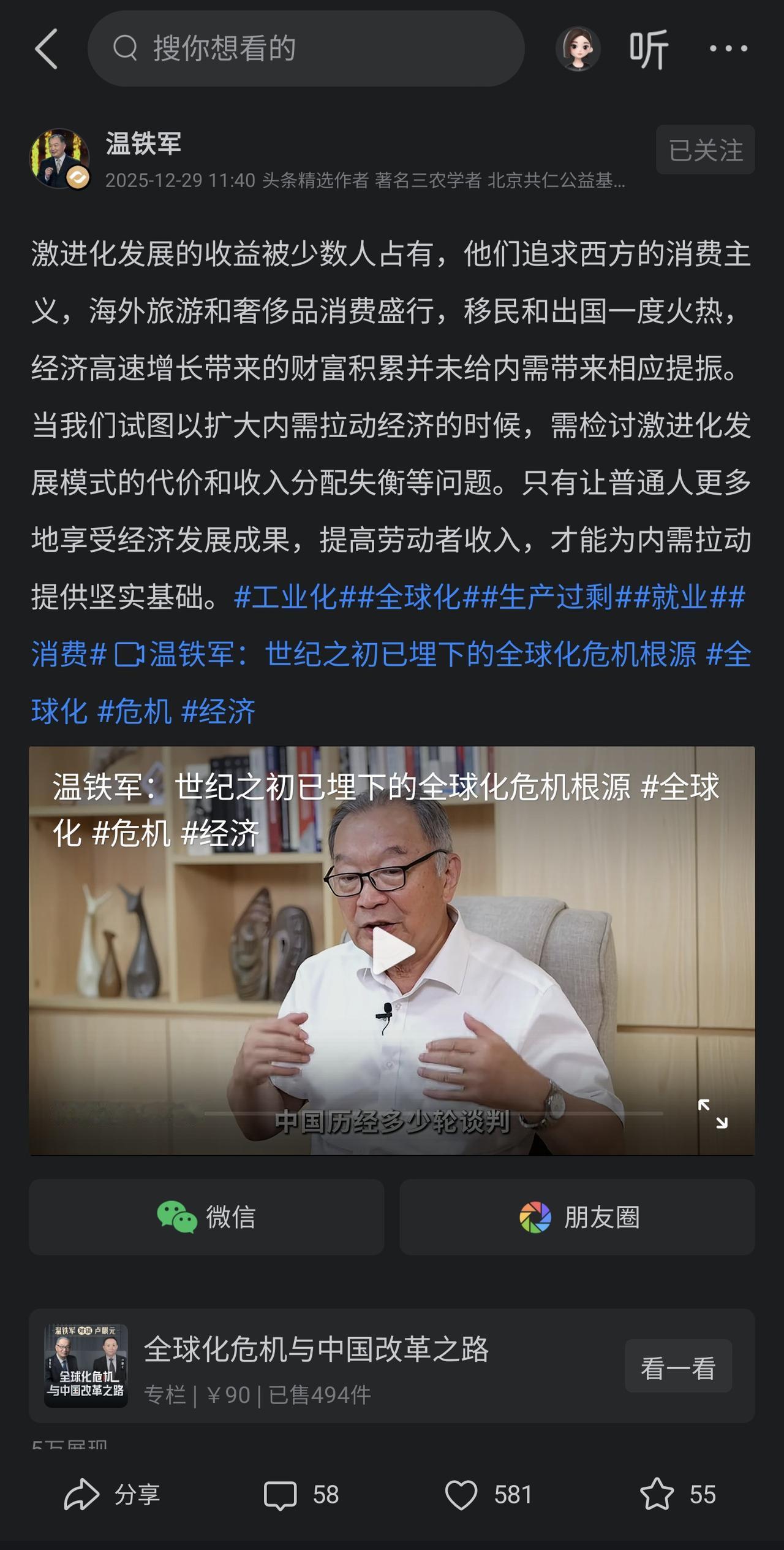为什么消费起不来,温铁军教授的这段话不是一针见血吗? 温教授这段话比较学术,用大白话可以这样理解: 咱们国家发展很快,但钱主要被少数人赚走了。这些人喜欢买外国名牌、出国旅游、送孩子留学,甚至移居海外。 结果就是虽然经济总量大了,但老百姓口袋里钱没多多少,国内消费还是起不来。现在想靠大家多花钱来拉动经济,就发现使不上劲。 所以得想想办法,不能光顾着快速发展,更要让普通人都能享受到发展的好处。只有大家收入提高了,有钱也敢花了,内需才能真正旺起来,经济也才能更健康。 简单说就是:发展成果要大家共享,老百姓有钱了,经济才有持久动力。其他砖家就不要再忽悠老百姓了,毕竟手里有钱,身后有保障,谁还不会花钱享受吗