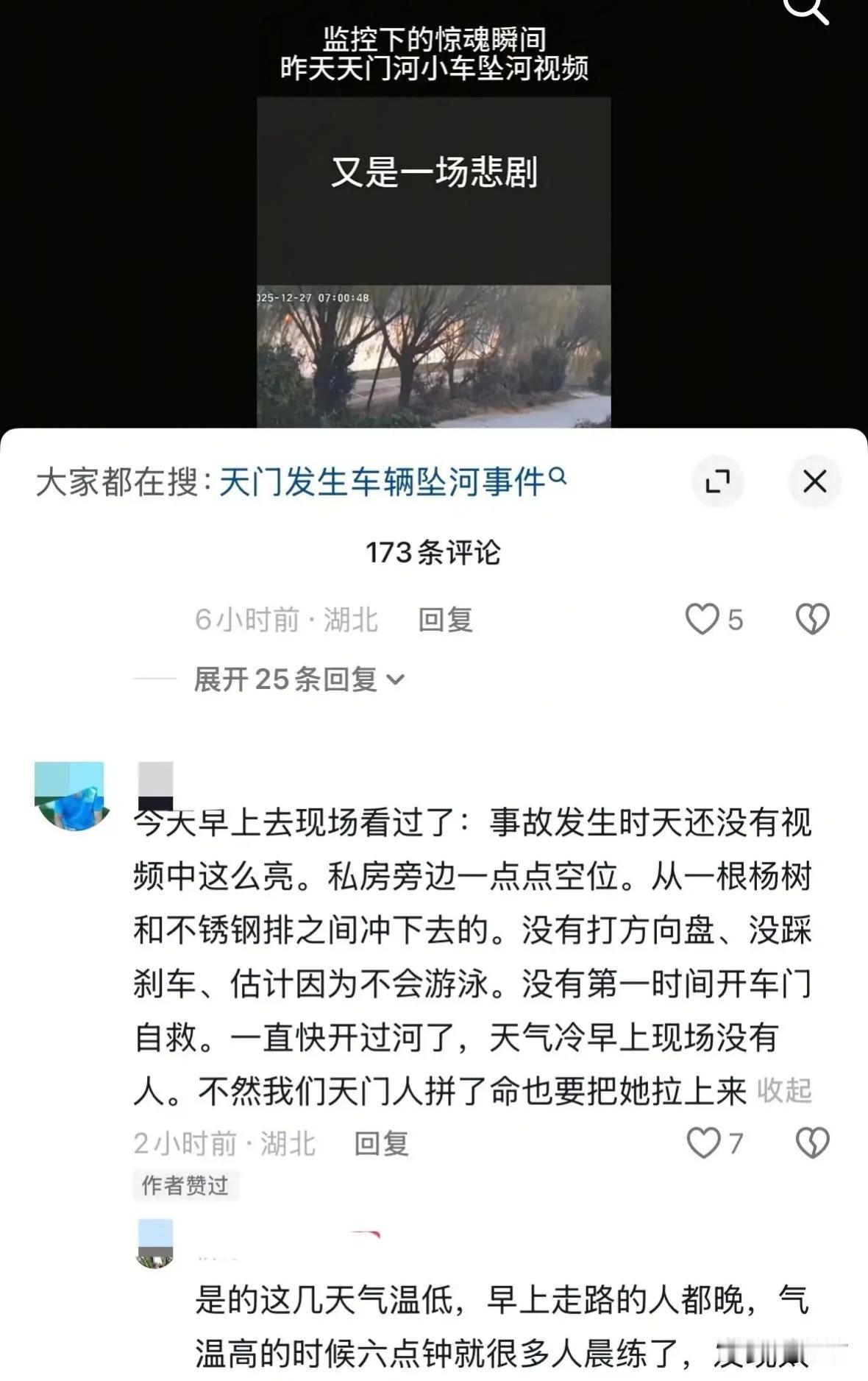 天门坠河身亡女孩后续来了, 她不是湖北人, 只是一个人在当地工作, 她的哥哥接到通知电话人都懵了, 他不敢相信自己26岁的妹妹就这么去了,明明前几天刚看到妹妹晒得朋友圈,买了新车,这就出事故了, 眼下她的哥哥正从陕西赶到湖北处理后事!不知道如何给父母交代, 白发人送黑发人的事情最是悲惨! 这事要从12月27号的早晨说起, 女孩穿着黑裤白鞋起了个大早, 开着她刚买的新车去上班, 大概七点的时候, 出现在这个路口, 因为驾驶失误, 车辆加速冲进了旁边的河里面, 由于天气还冷在加上不会游泳, 这才没有第一时间逃出车外, 由于当时天有点黑, 路上也没有行人, 水里温度非常低, 女孩绝望的在车里去世了, 要是她谨慎开车或许就没事了, 要是她打下方向盘就可以捡回一条命, 要是她晚一点出门上班, 或许就会有人及时发现她落水, 可现实没有那么多可能, 这么漂亮的女孩就这么的走了, 花一样的年纪真是太可惜了! 从这起事故来看, 我们开新能源车一定要注意安全, 谨慎驾驶,做到不伤害他人, 也不伤害自己, 开车确实需要四肢协调反应快的人, 在这里只能一生长叹可惜了, 祝她一路走好吧!