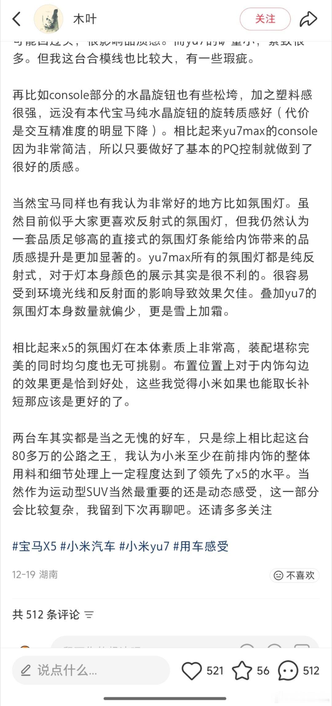 X5车主提车小米YU7,评价YU7内饰做工领先X5一个档次,要知道这台X5几年前提车要80万。