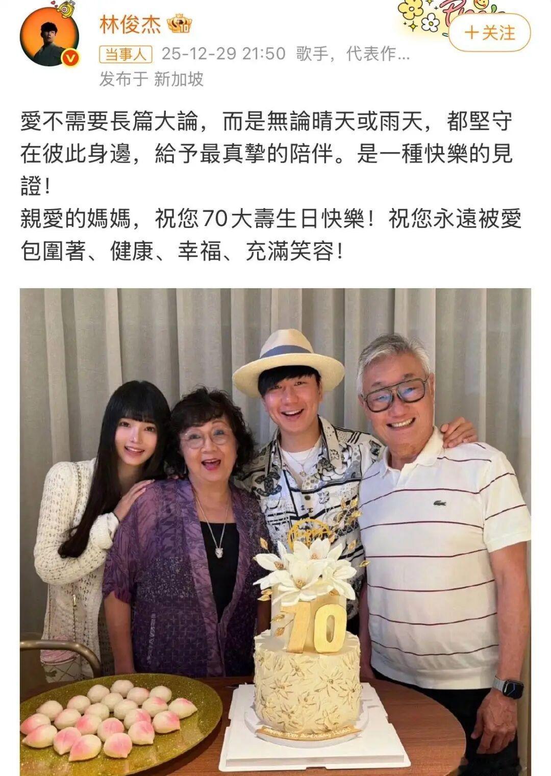 双喜临门!林俊杰携女友为母庆70大寿,官宣恋情甜度拉满 12月29日,华语乐坛顶流林俊杰在社交平台晒出一组家庭合照,为母亲庆祝70岁大寿的同时,正式官宣恋情,让全网陷入狂欢。配文“亲爱的妈妈,祝您70大寿生日快乐!祝您永远被爱包围着、健康、幸福、充满笑容!”既满含对母亲的孝心,又暗藏对恋情的珍视,字里行间皆是温暖。 照片中,寿宴现场布置得格外温馨,金色“70”字样气球与鲜花相映成趣,寿星林妈妈端坐中央,头戴生日皇冠,身着精致服饰,搭配卷发与金丝眼镜,气质温婉雍容。林俊杰身着得体服饰站在母亲身侧,身旁的女友则以米白色穿搭出镜,笑容甜美温婉,一手自然搭在准婆婆肩上,头挨着头亲密互动,宛如情同母女,完全不见辈分隔阂。四人同框依偎,脸上都洋溢着真挚灿烂的笑容,家庭氛围和谐治愈,满屏都是岁月静好的幸福感。 此次官宣并非毫无征兆,而是一段低调感情的水到渠成。早在2024年林俊杰新加坡演唱会时,女友就曾现身后台亲密热聊,还稳坐第一排VIP专属席位;2025年以来,两人先后被拍到在东京咖啡店甜蜜约会、同游新西兰,甚至穿着同色系情侣装现身洛杉矶街头,种种蛛丝马迹早已让网友猜测不断。而林俊杰选择在母亲70岁大寿这个极具纪念意义的家庭时刻,让女友正式融入核心家庭聚会,既体现了对这段感情的坚定认可,也是给家人最安心的交代,被网友解读为“最有仪式感的官宣”。 作为出道近二十年的“行走的CD”,林俊杰凭借《江南》《曹操》等经典作品陪伴了一代人的成长,而他的感情生活始终保持低调,此次打破惯例的公开举动,瞬间引爆全网。话题“林俊杰官宣恋情”迅速冲上热搜榜首,一小时内点赞量破百万,阅读量飙升数亿。周杰伦、张怀秋、谭维维等圈内好友纷纷留言送祝福,粉丝们更是激动表示“青春里的歌手终于找到幸福”“双重喜事必须狠狠祝福”。 据悉,女友七七(Annalisa)是美籍华裔,不仅毕业于纽约帕森斯设计学院这样的顶尖艺术院校,还是手握多地豪宅的豪门才女,与林俊杰虽有二十余岁年龄差,却在气质与阅历上高度契合。而照片中她与林妈妈亲密无间的互动,也让网友调侃“解锁婆媳天花板模式”,足以见得这段关系已获得家庭的充分接纳。 从舞台上的金曲歌王到生活中懂得珍惜的深情男人,林俊杰用一场温馨的寿宴,完成了爱情与亲情的双重告白。这场岁末的幸福官宣,既是给母亲最好的生日礼物,也是给粉丝青春记忆的圆满答卷,更让大家期待着这位情歌王子未来更多幸福篇章的开启。林俊杰恋情 林俊杰 林俊杰jj25 林俊杰侧脸照