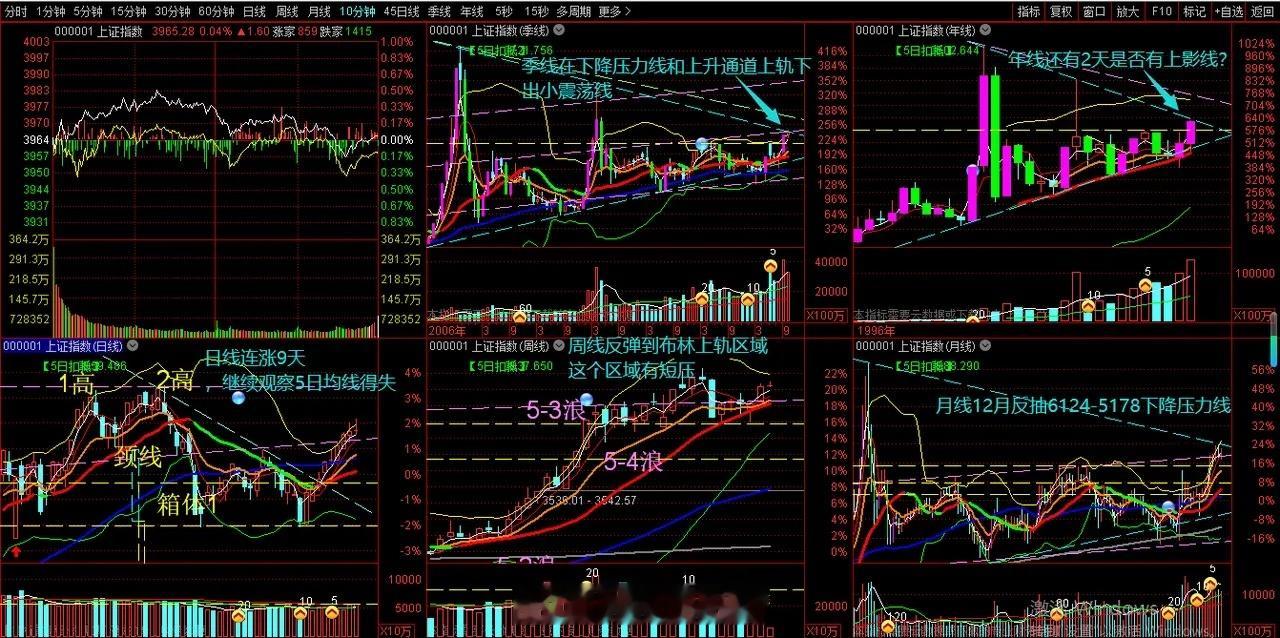 2025.12.29日复盘,上证指数多周期图,还有两个交易日收周,月,季,年线,从图中可以看出,还有两个交易日决定年线是否有上影线?从年线可以看出布林上轨4600还没到,26年考虑低点在哪里?是否继续上涨到布林上轨?低点是否回踩3731?26年1季度是否从布林上轨外拉回震荡?月线12月回抽6124-5178下降压力线,26年能否直接突破?不能还会在下降压力线下震荡?周线接近布林上轨,量小是否继续拉回?日线连续涨了9天,观察5日均线得失?创业板指数多周期图,同样是年线在下降压力线下出现上影线?季线在下降压力线出现震荡拉回,1季度观察3季度线得失?月线回抽下降压力线?能否直接突破?不能还会拉回震荡?日线观察多空线或者布林中轨得失?
