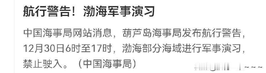 快讯!快讯! 就在刚刚,准备睡觉呢?看到了一个消息:“航行警告——渤海军事演习”! 时间12月30日6:00~17:00,也就是明天。 您看吧,这还接起来了呢?东部战区“正义使命—2025”演习刚刚结束,中国海事局网站的消息就来了,也没说是哪个战区进行军事演习,代号也没透露! 我在想,这一连串的动作是不是根据作战计划来的,渤海军事演习怎么也得有个假想敌吧?也不知道是谁?