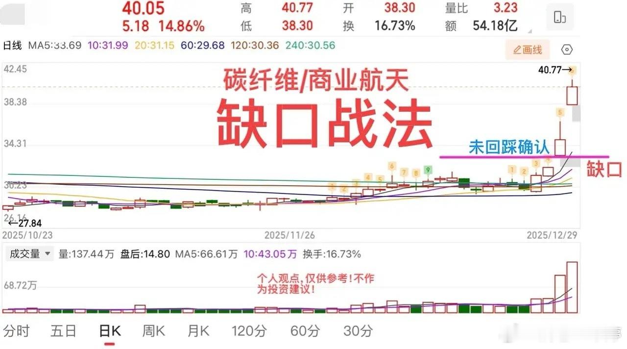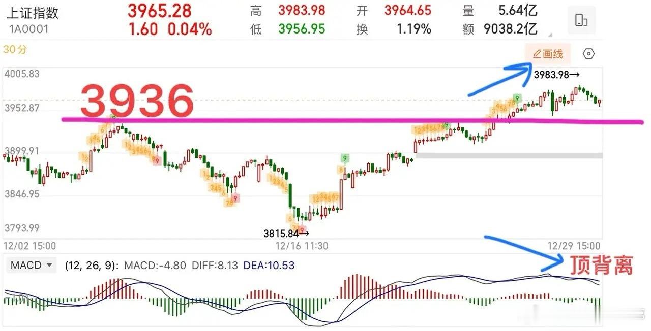 行情研判:资金分歧加大,3936成关键防线资金分歧加剧,3936点依旧是行情关键。上证指数30分钟级别顶背离,冲高回落留下明显上引线,凸显上方抛压加重,对量能要求提升,短线大概率震荡或回调。守住3936颈线位,行情就仍属强势震荡,整理后向上概率大;若跌破则调整周期或拉长。4000点大关难以一蹴而就,震荡盘整消化获利筹码后,再上攻的可能性更高。板块层面,商业航天短线将现内部分化,实体阳线收窄引发资金分歧,大概率横向震荡,但趋势未破5日线,操作需把握高切低节奏。周末分享的《缺口战法》案例,今日大幅高开未回踩缺口确认,未出现“B”点,直接放弃即可。