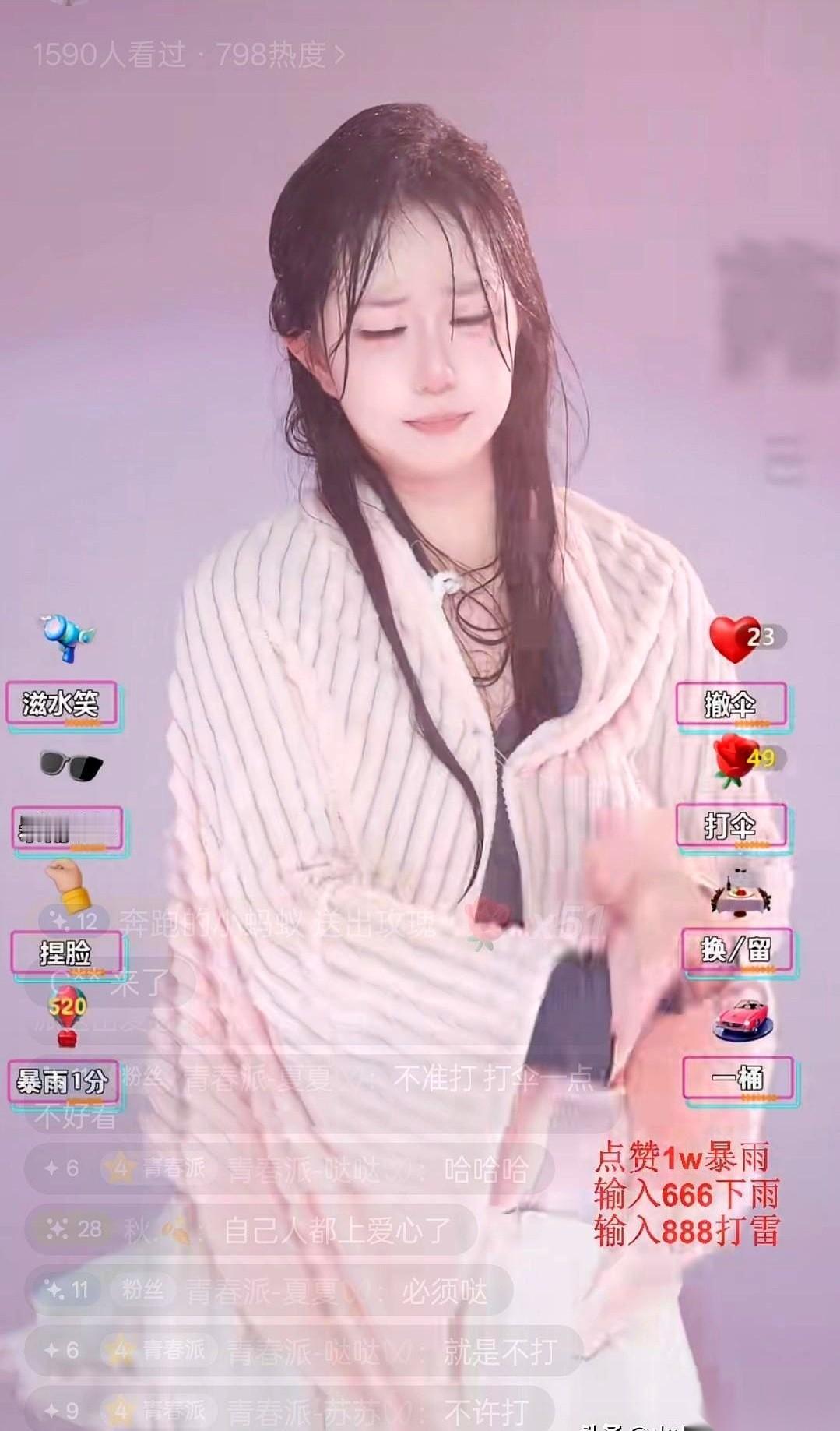 我发誓,我这辈子都没见过这么离谱的直播。 一个姑娘,在瓢泼大雨里跳舞,头发全湿了,贴在脸上,眼睛都睁不开。 这不是偶像剧,是真的直播,她头顶上就是个喷头。观众刷个礼物,水就“哗”一下浇下来。 我当时就愣住了。 评论区告诉我,刷不同的礼物,可以控制下雨的大小,或者,能换来一把伞,让她喘口气。 我浑身发冷。 这他妈是什么?赛博斗兽场吗? 把一个活生生的人,当成一个宠物,一个玩物。用钱,决定她是挨浇,还是能被短暂地“善待”。 那些刷礼物让她淋雨的人,到底在想什么? 是生活里太不如意了,需要花钱看别人更惨来找点平衡?还是单纯觉得,能掌控别人的狼狈,特有快感? 还有那个姑娘。 我不知道她经历了什么,才要用这种方式挣钱。 她低着头,被水冲得抬不起脸,那一刻我真的…心里堵得慌。 感觉人的尊严,在流量和打赏面前,被踩得稀巴烂。 真的,有些钱,看着都觉得烫手。
