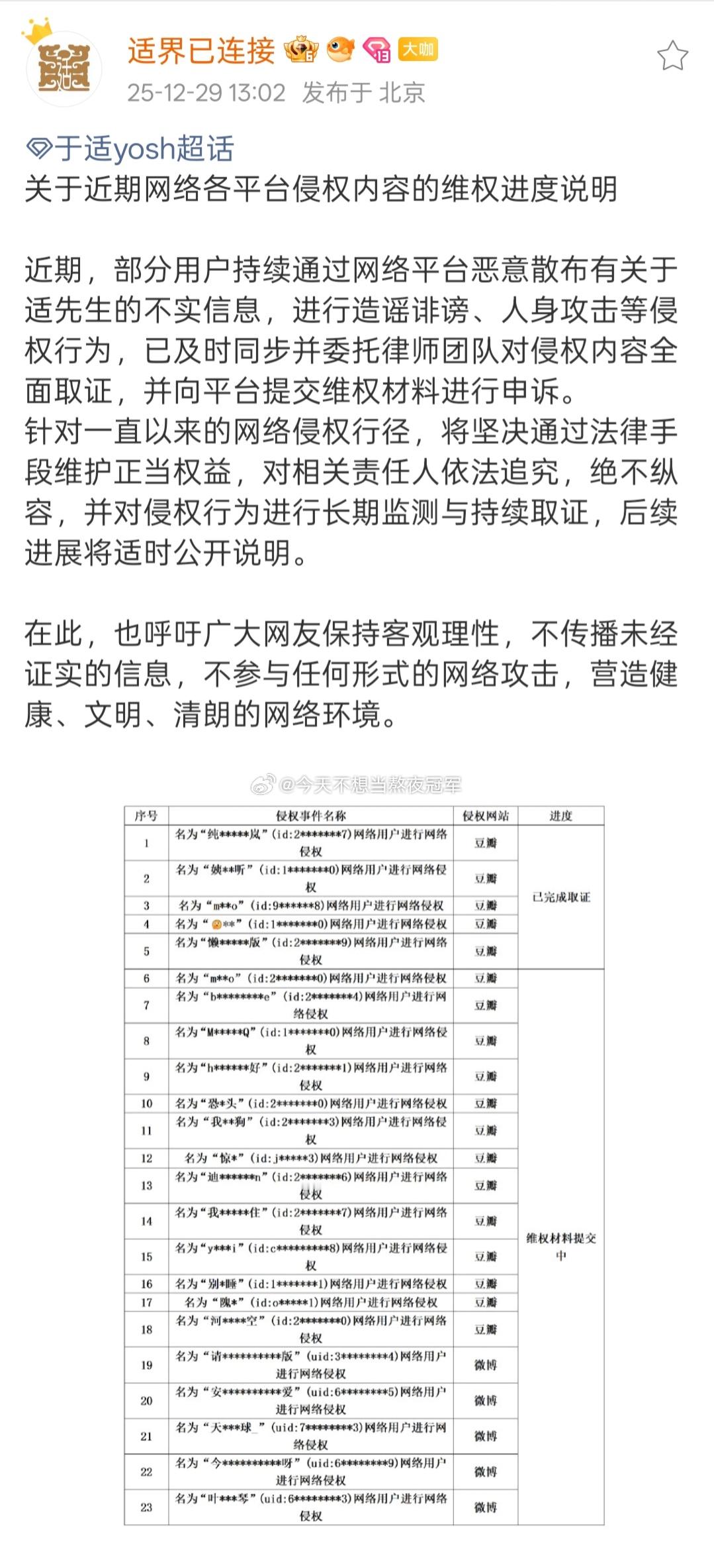 tg. 于适工作室发了最新维⭕进展,大眼和郫县告嘿/取证20➕