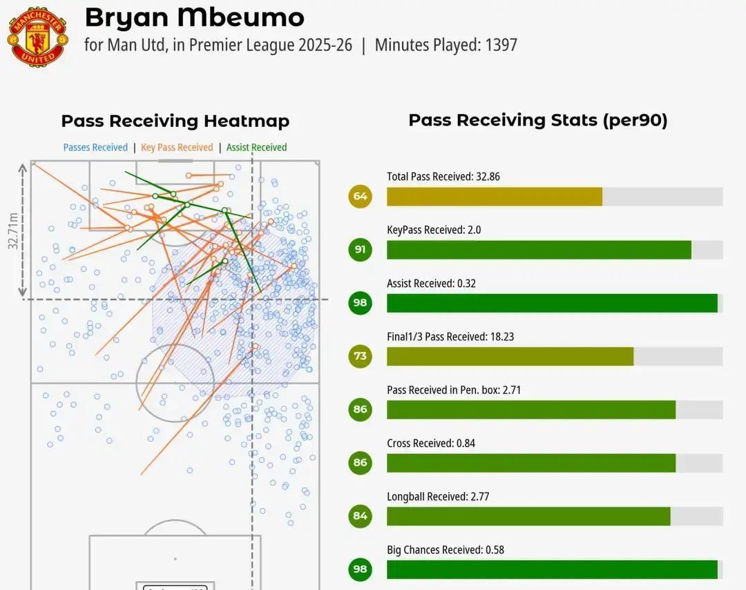 曼联新9号,首秀就踢丢单刀 姆贝乌莫从右路杀到中路,一脚推偏,全场嘘声。 球迷以为他水土不服,其实是滕哈格让他干脏活: 不再边路单挑,改去肋部做墙,帮拉师傅扯空档。 布伦特福德时代,他场均2.7脚远射,12球,数据漂亮。 曼联要求先逼抢再射门,触球少1/3,进球却更值钱。 背身拿球从53%涨到61%,每场多抢1.5次球权。 我看球二十年,这种牺牲最磨人。 踢边锋能刷存在感,踢影锋得背锅。 他要是咬牙挺过磨合,曼联前场就活了。 挺不过,冬窗还得回右路当耗材。